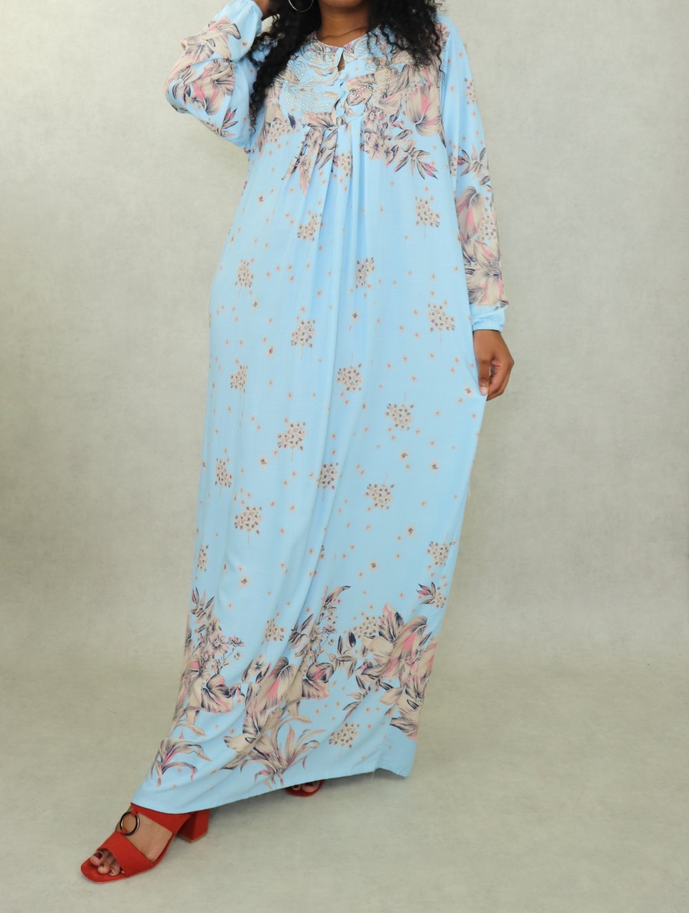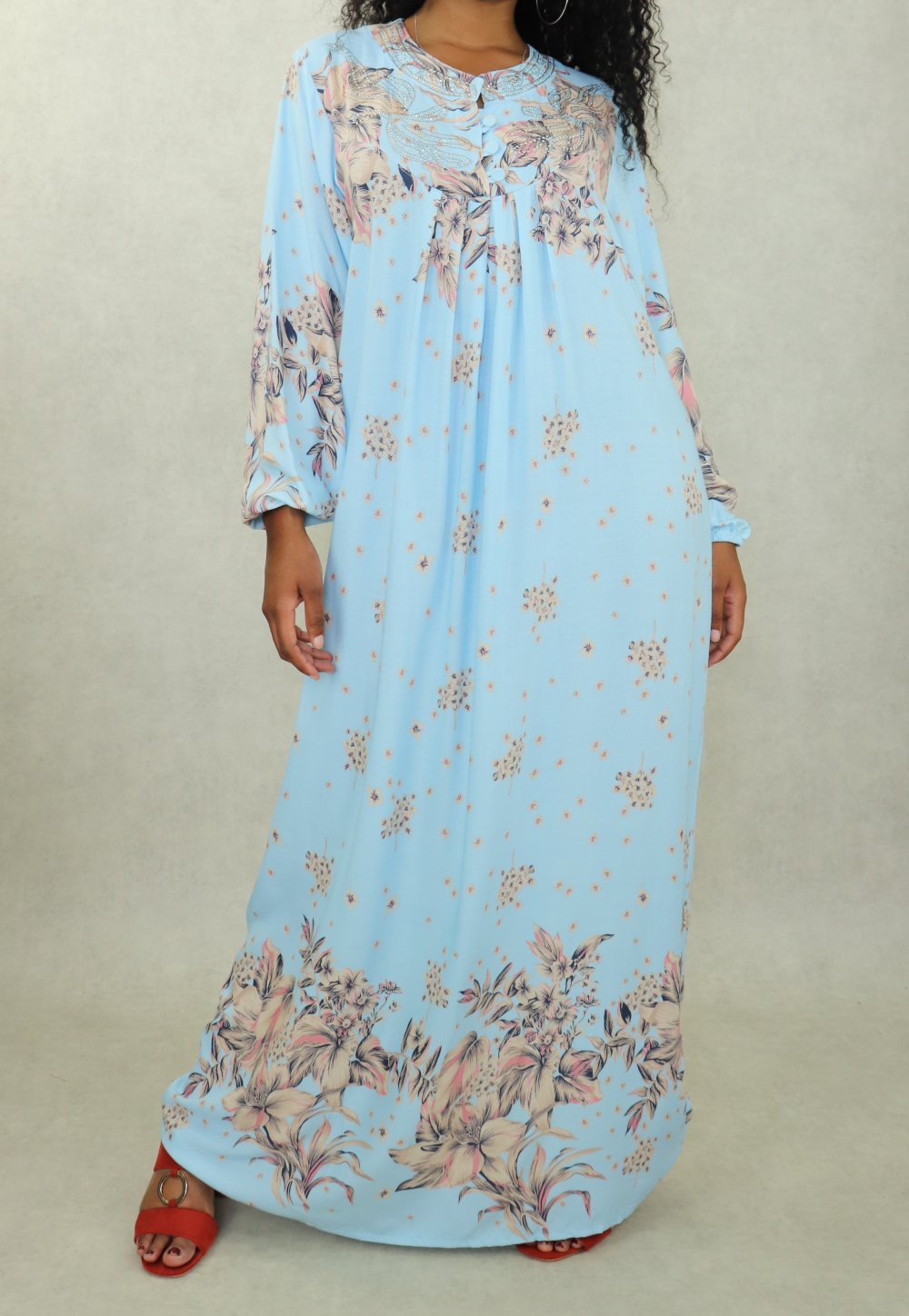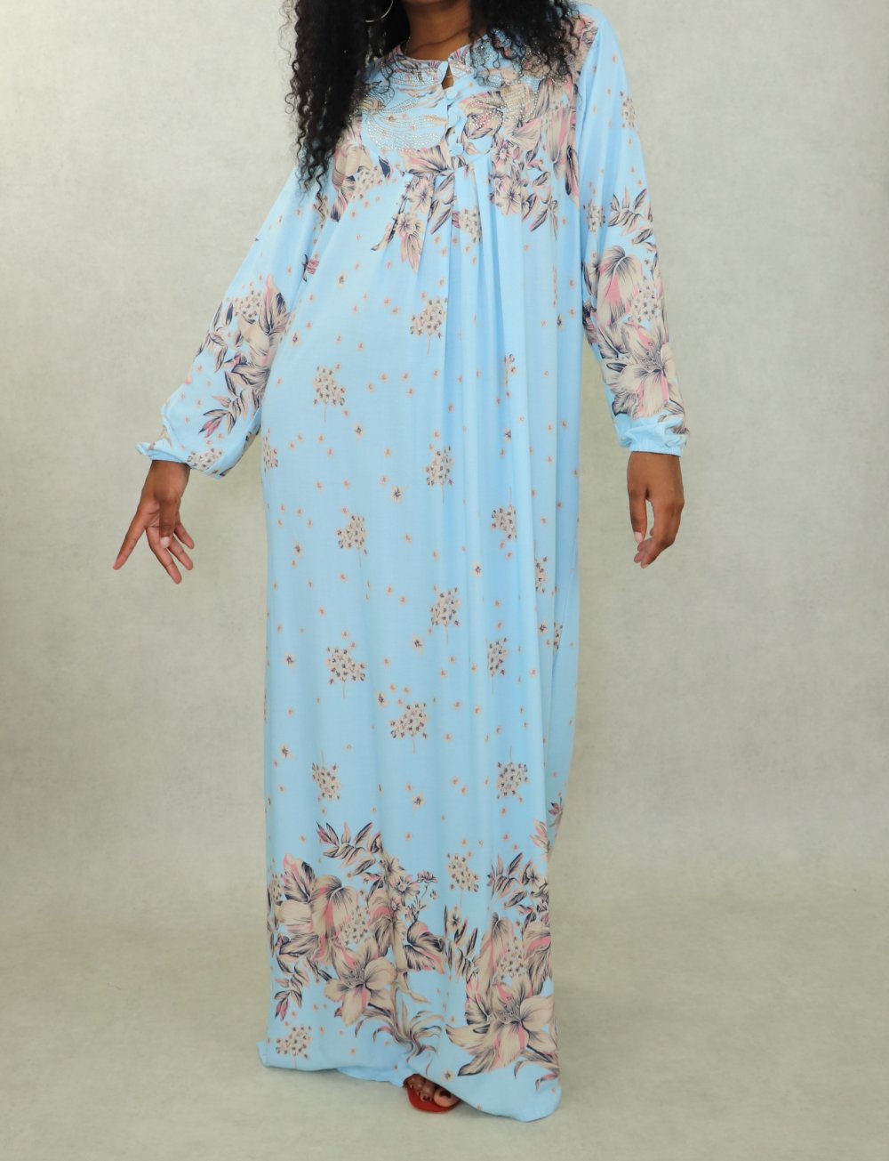 Robe d’intérieur avec motifs à fleurs sur fond Vert d'eau. Col rond avec quelle que strasse et trois boutons décoratifs sur l'avant, manches longues finition élastiques aux poignets, elle est douce et agréable.