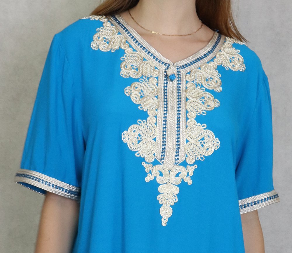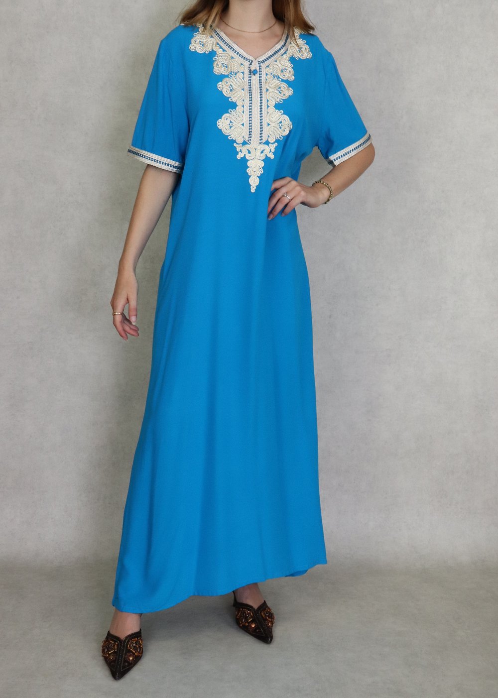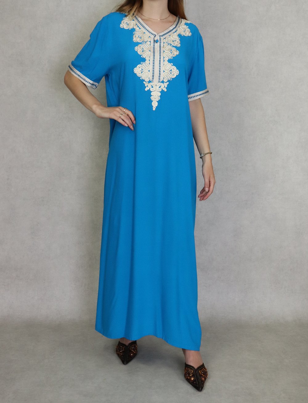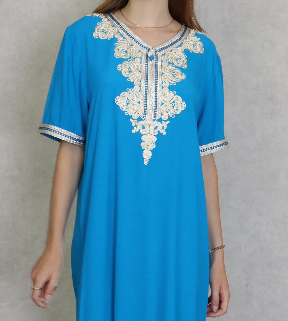 Robe orientale longue brodee manches courtes et decontractee pour femme - Couleur bleu turquoise