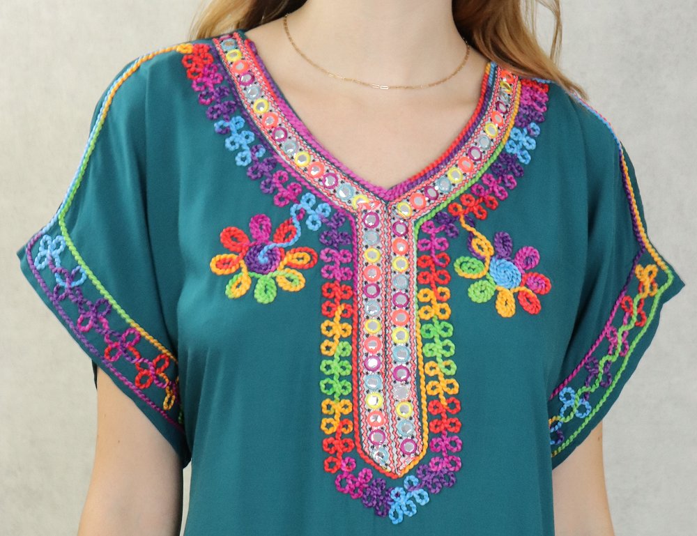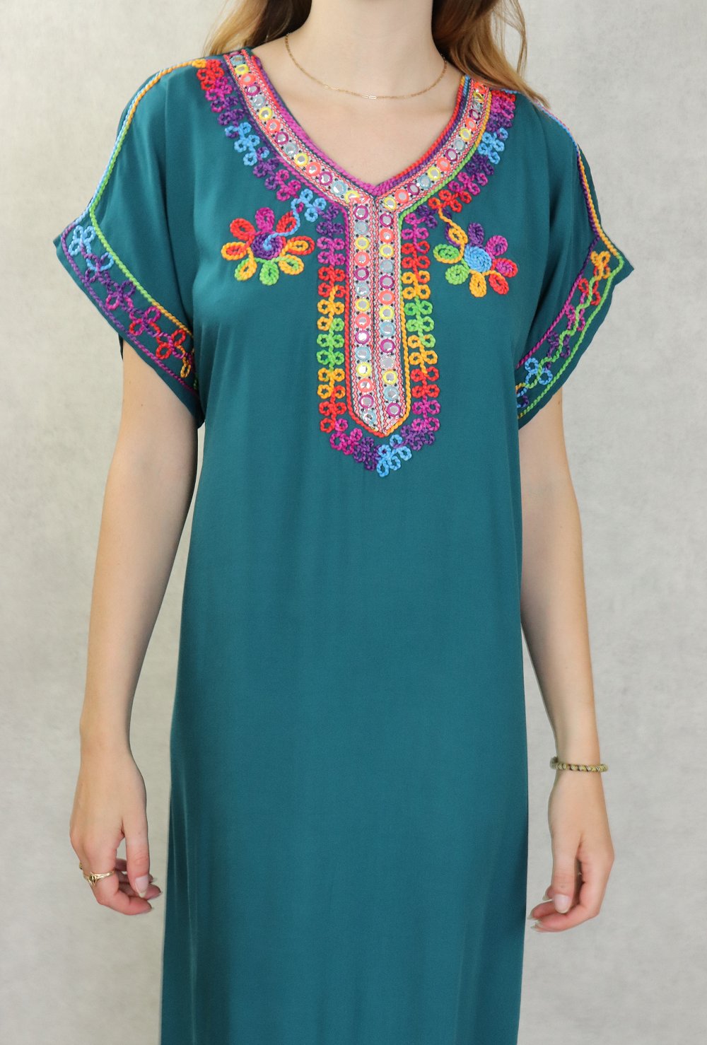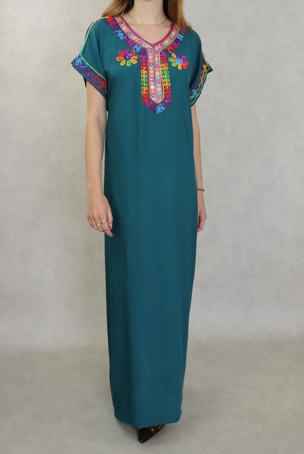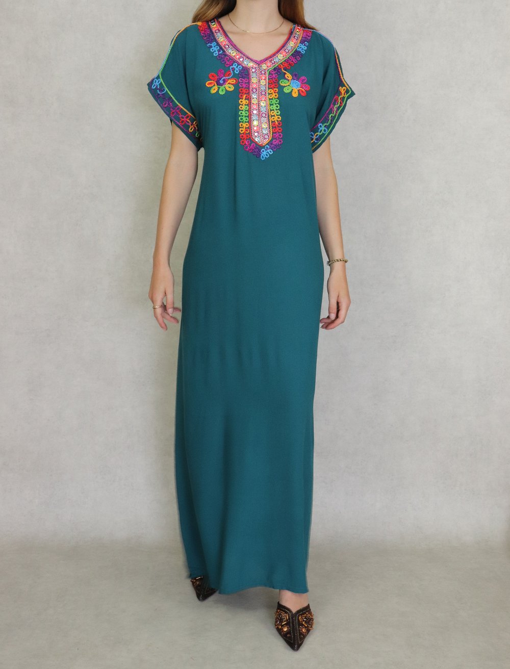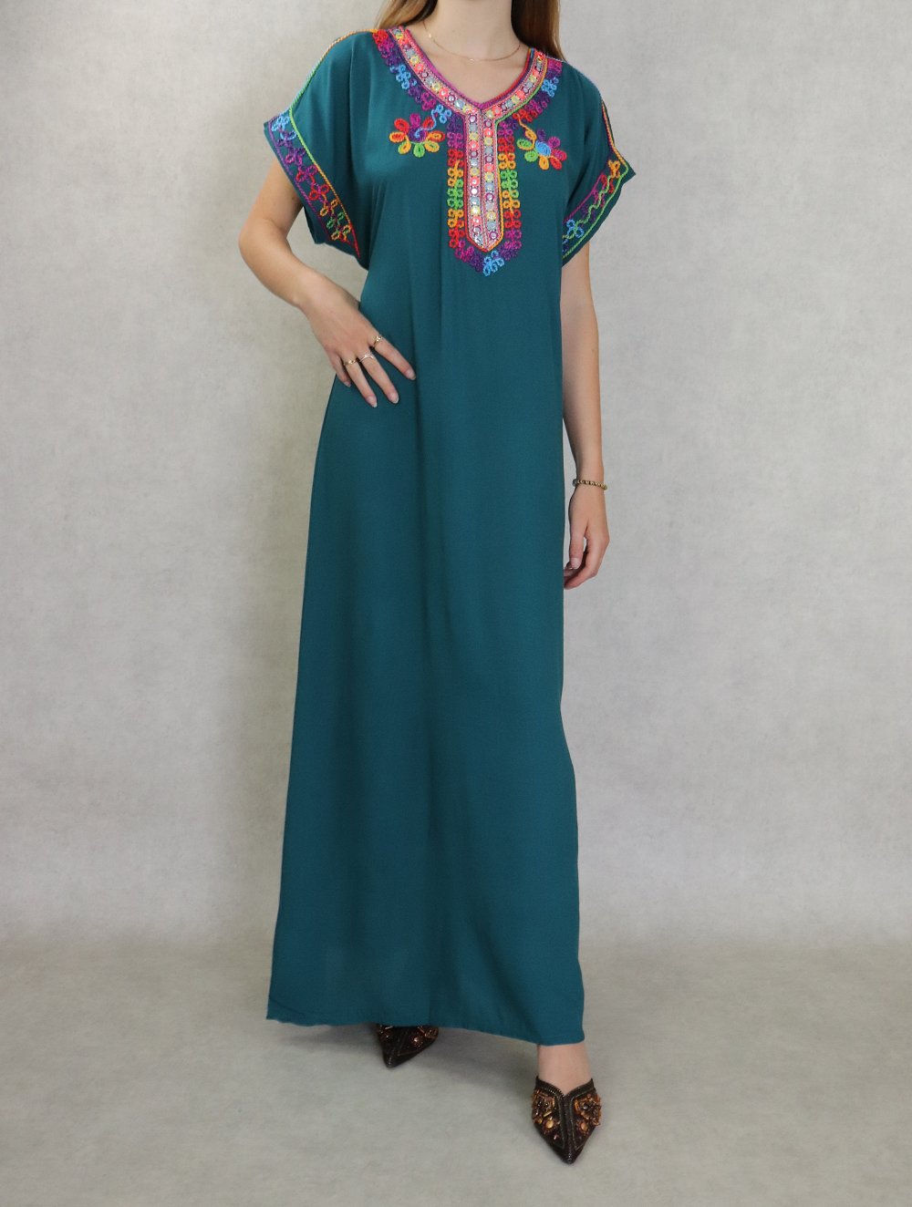 Cette belle robe longue coupe droite, ornée d'un fil multicolore, avec effet miroirs au niveau dU buste, col en V.