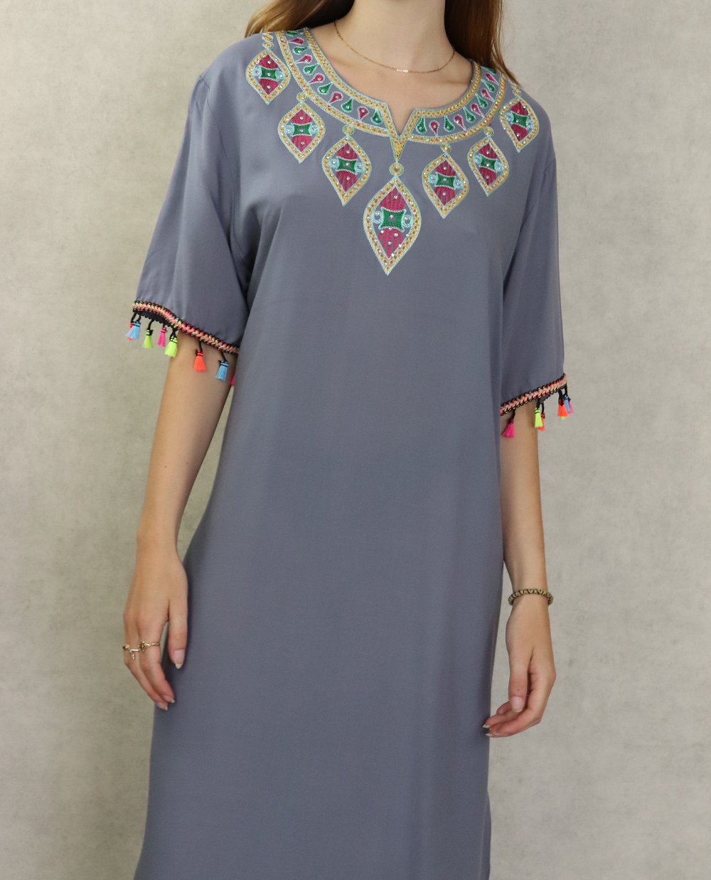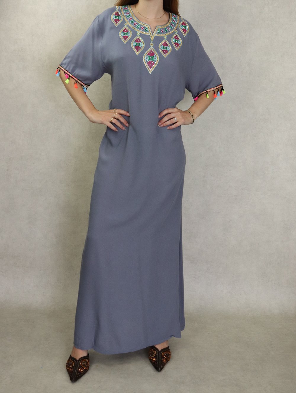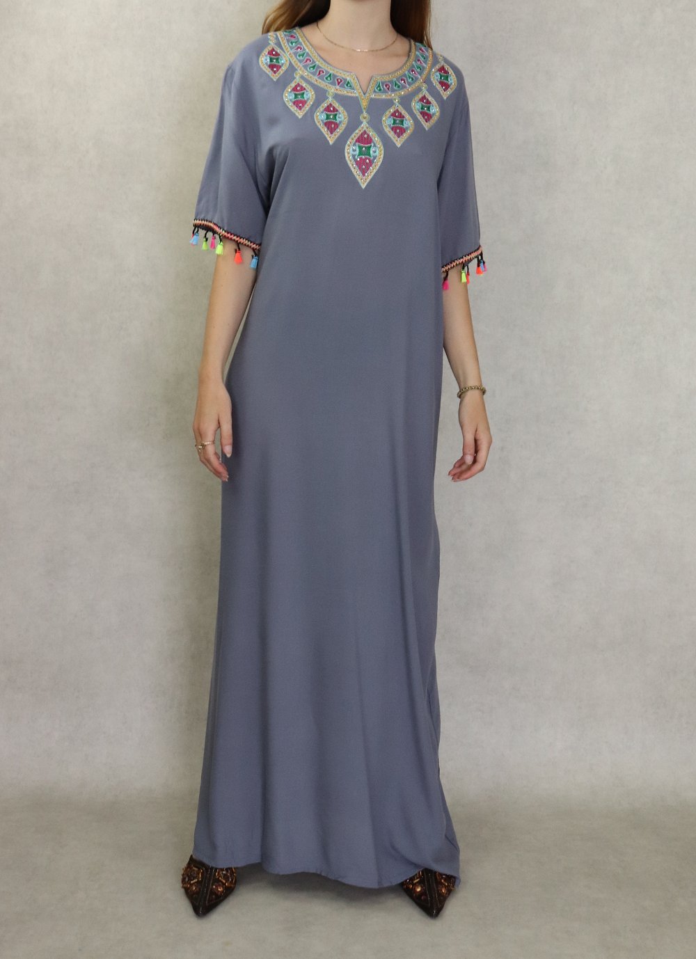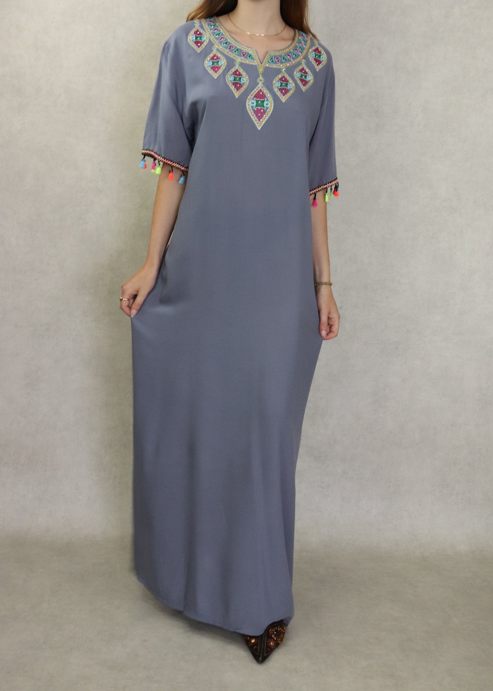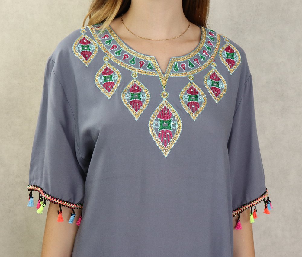 Robe longue fluide et confortable avec broderies et strass pour femme - Couleur gris Vetement & Accessoire
