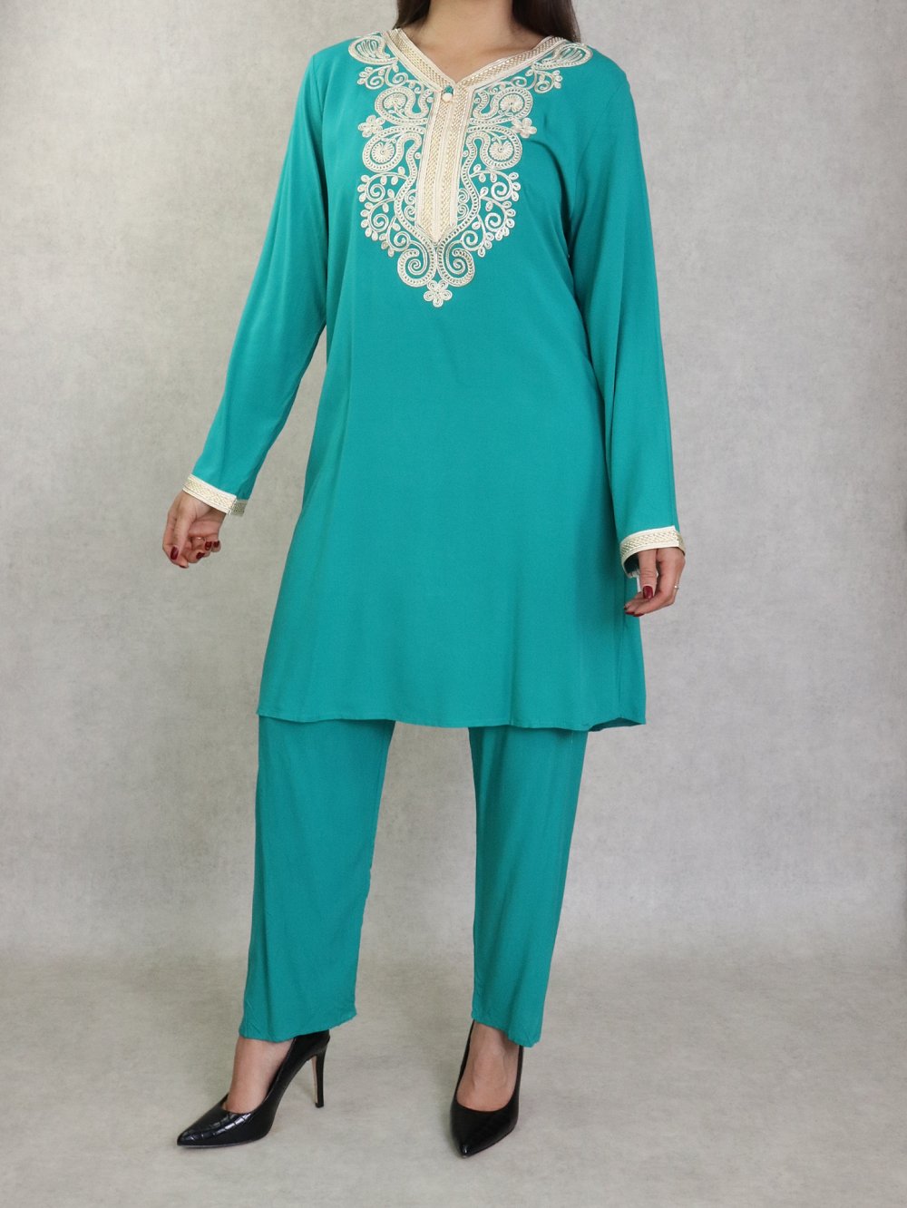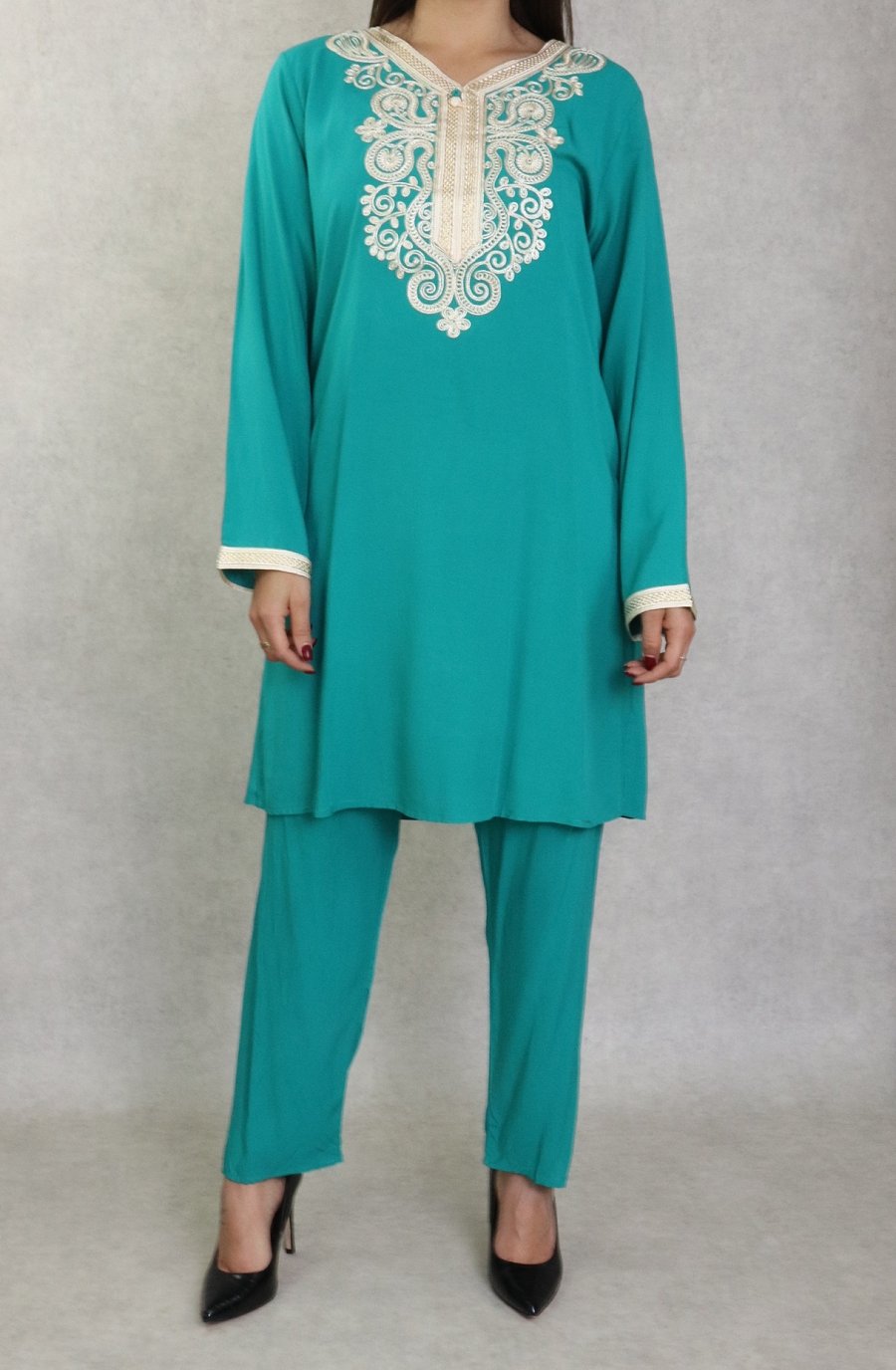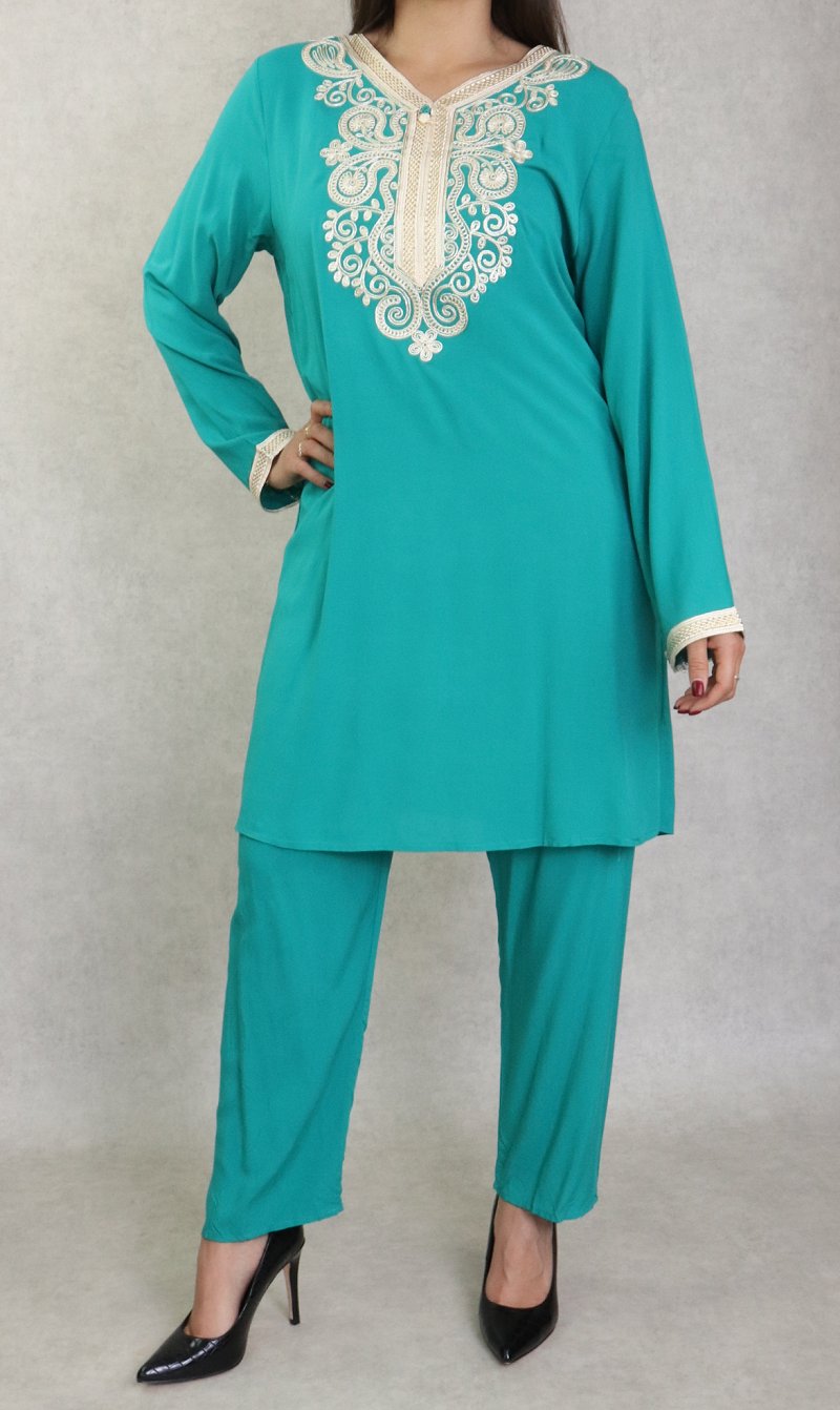 Magnifique Jabador chic pour femme composé d’une tunique avec broderies sur le buste et sur les manches, et son pantalon assorti avec ceinture élastique, coupe droite.