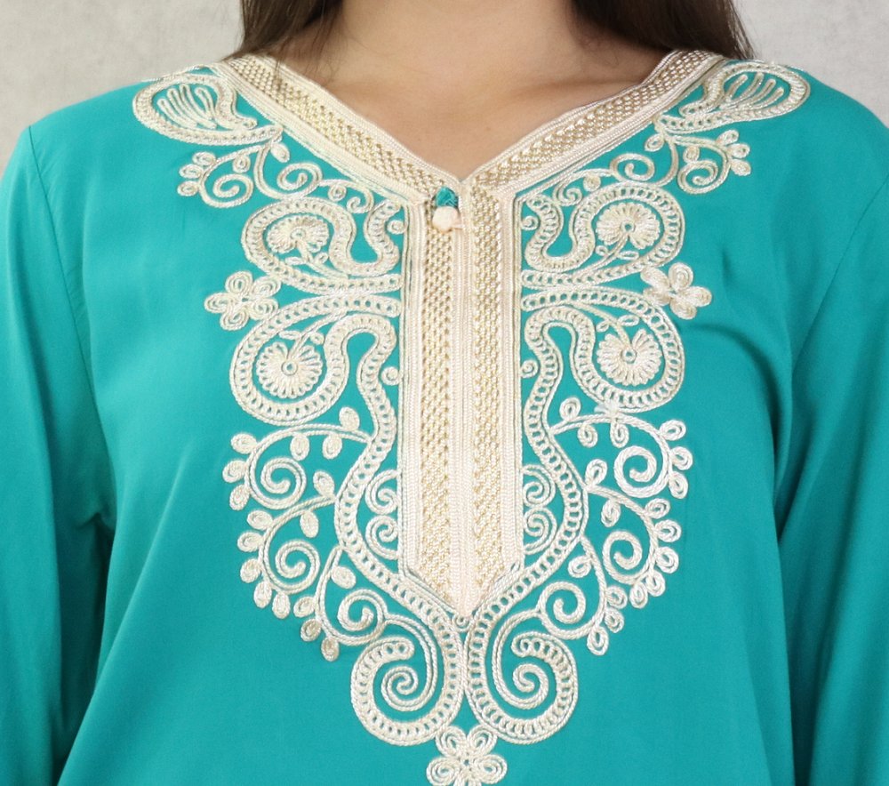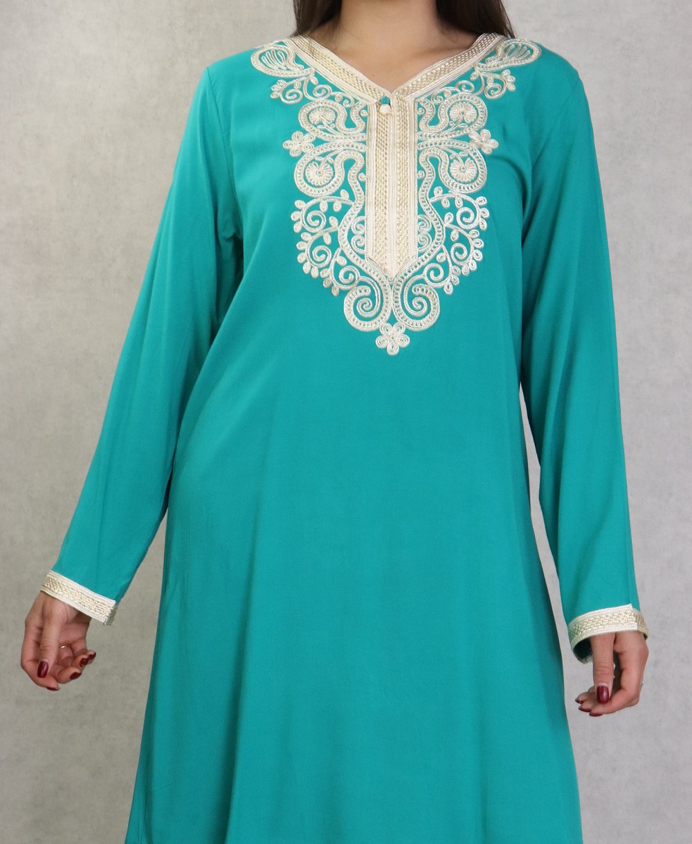 Robe longue avec broderies et strass style caftan marocaine pour femme - Couleur Bleu turquoise - REF. 36154 (29.00 €)