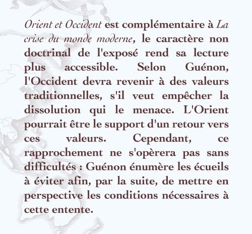 Orient et Occident est complémentaire à La crise du monde moderne, le caractère non doctrinal de l'exposé rend sa lecture plus accessible. Selon Guénon, l'Occident devra revenir à des valeurs traditionnelles, s'il veut empêcher la dissolution qui le menace. L'Orient pourrait être le support d'un retour vers ces valeurs. Cependant, ce rapprochement ne s'opèrera pas sans difficultés : Guénon énumère les écueils à éviter afin, par la suite, de mettre en perspective les conditions nécessaires à cette entente.