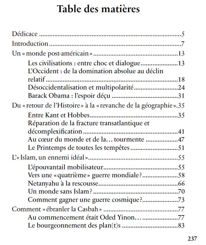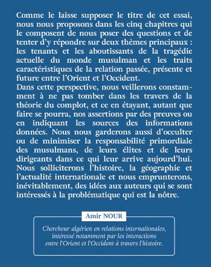 Comme le laisse supposer le titre de cet essai, nous nous proposons dans les cinq chapitres qui le composent de nous poser des questions et de tenter d’y répondre sur deux thèmes principaux : les tenants et les aboutissants de la tragédie actuelle du monde musulman et les traits caractéristiques de la relation passée, présente et future entre l’Orient et l’Occident. Dans cette perspective, nous veillerons constamment à ne pas tomber dans les travers de la théorie du complot, et ce en étayant, autant que faire se pourra, nos assertions par des preuves ou en indiquant les sources des informations données. Nous nous garderons aussi d’occulter ou de minimiser la responsabilité primordiale des musulmans, de leurs élites et de leurs dirigeants dans ce qui leur arrive aujourd’hui. Nous solliciterons l’histoire, la géographie et l’actualité internationale et nous emprunterons, inévitablement, des idées aux auteurs qui se sont intéressés à la problématique qui est la nôtre.