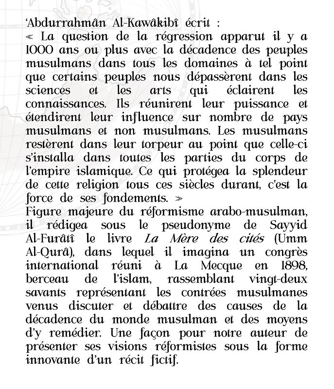 Figure majeure du réformisme arabo-musulman, il rédigea sous le pseudonyme de Sayyid Al-Furâtî le livre La Mère des Cités (Umm Al-Qurâ), dans lequel il imagina un congrès international réuni à La Mecque en 1898, berceau de l’islam, rassemblant vingt-deux savants représentant les contrées musulmanes venus discuter et débattre des causes de la décadence du monde musulman et des moyens d’y remédier. Une façon pour notre auteur de présenter ses visions réformistes sous la forme innovante d’un récit fictif.