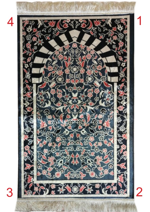 Recevez ce grand tapis de luxe (70 x 115 cm) avec dessous antidérapant. Très doux au toucher avec motif indiquant la direction de la qibla (La Mecque, pour ne pas mélanger les pieds et la tête).
