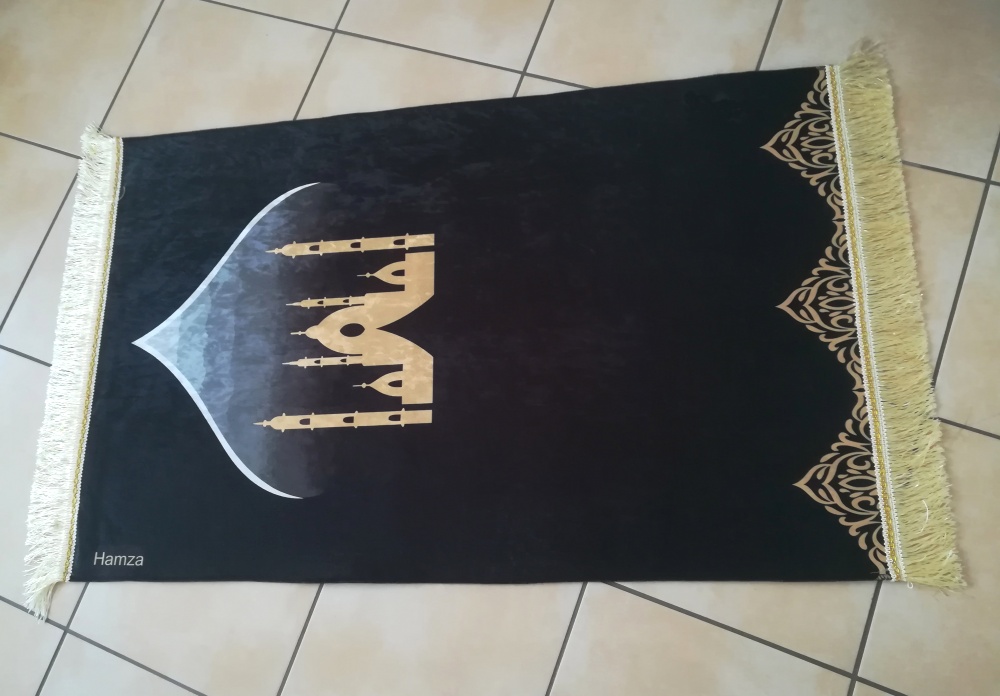 Grand Tapis de prière adulte couleur noir doré en velours brillant personnalisé avec le prénom de votre choix - REF. 39034 (23.00 €) - En Promotion à 19.00 €