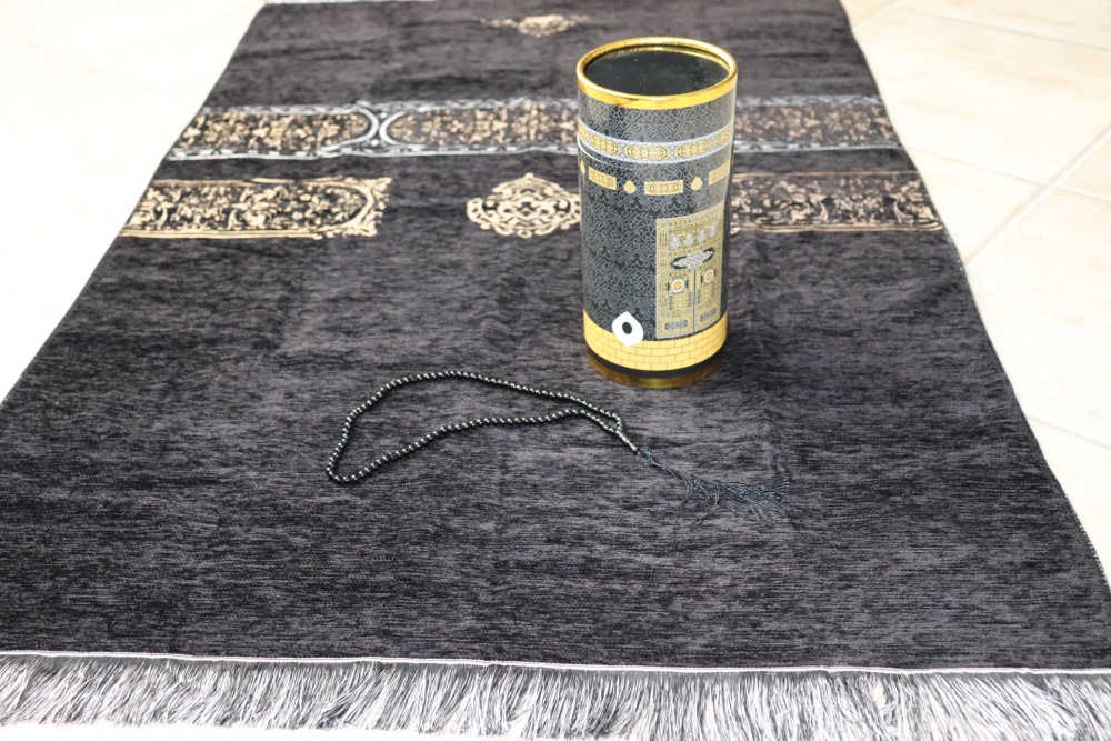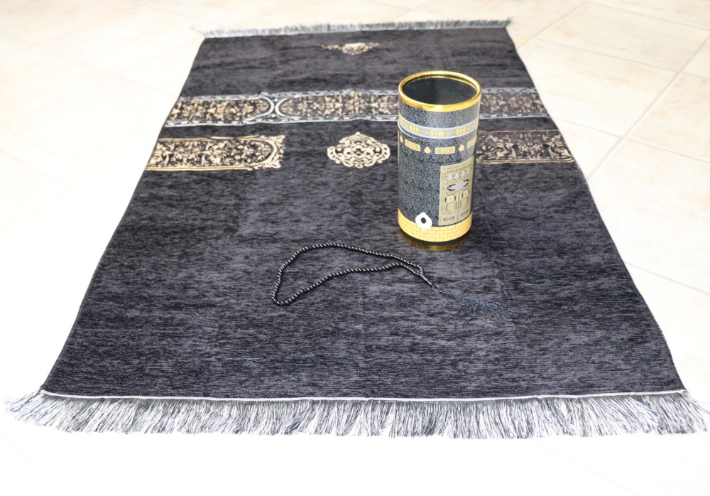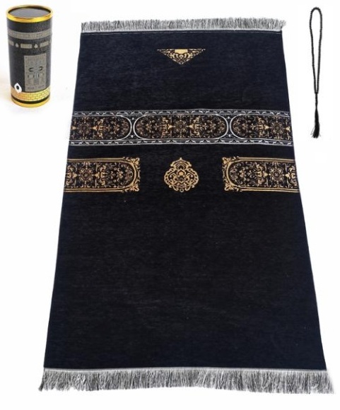 Coffret Cadeau Prière Tapis et chapelet de luxe (boite ronde dorée) - Couleur noir avec motif de la Kaaba - REF. 40032 (14.90 €)