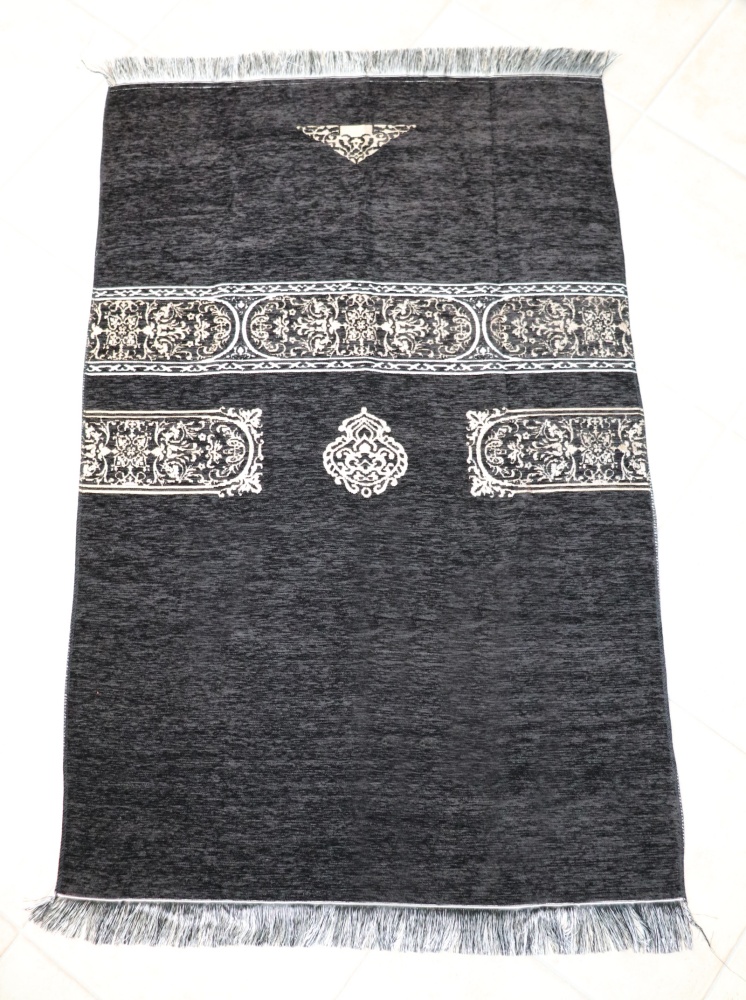 • Un tapis de prière adulte (grande taille 70 x 110 cm), avec motif arabesque et frange.