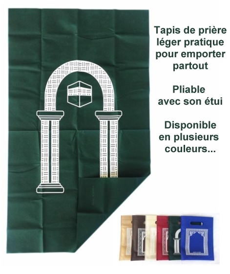 Ce tapis très léger permet de faire sa prière n'importe où. Pliable avec sa sacoche, transportable idéal pour voyages et déplacements... Vous pouvez le laisser dans la boite à gant, au fond de votre sac ou cartable...