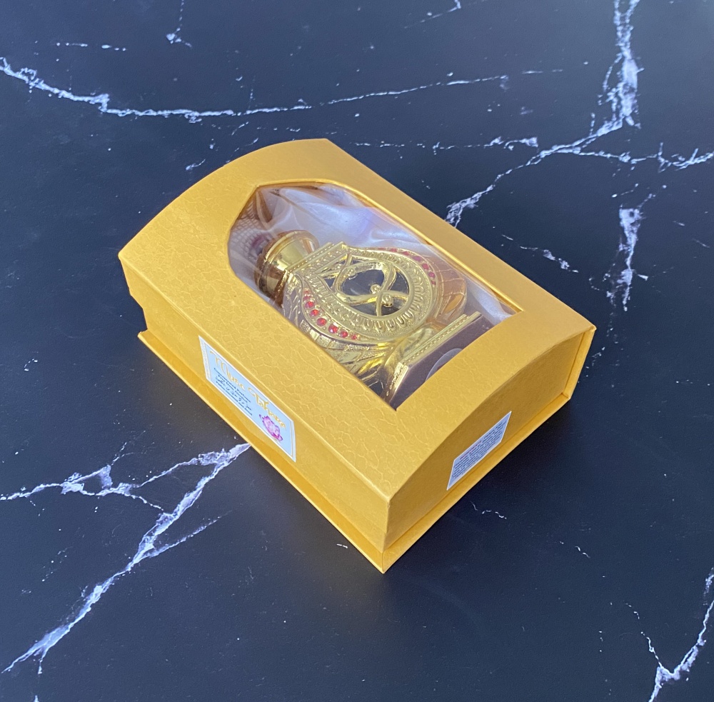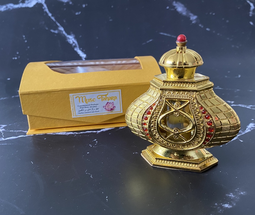 Parfum Musc Tahara pour femmes - Bouteille metallique doree avec boite cadeau jaune