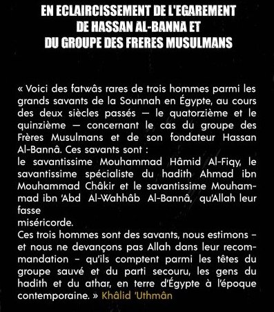 Fatwâs rares de trois grands savants d’Égypte en éclaircissement de l’égarement de Hassan Al-Bannâ et du groupe des Frères Musulmans Compilées et annotées par : Aboû ‘Abdila‘lâ Khâlid ibn Mouhammad ibn ‘Outhmân al Misrî