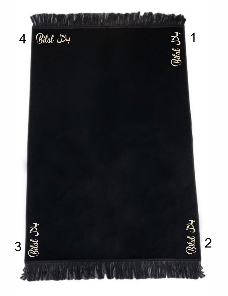 Tapis de priere adulte en velours couleur noir uni sans motifs personnalise avec le prenom de votre choix