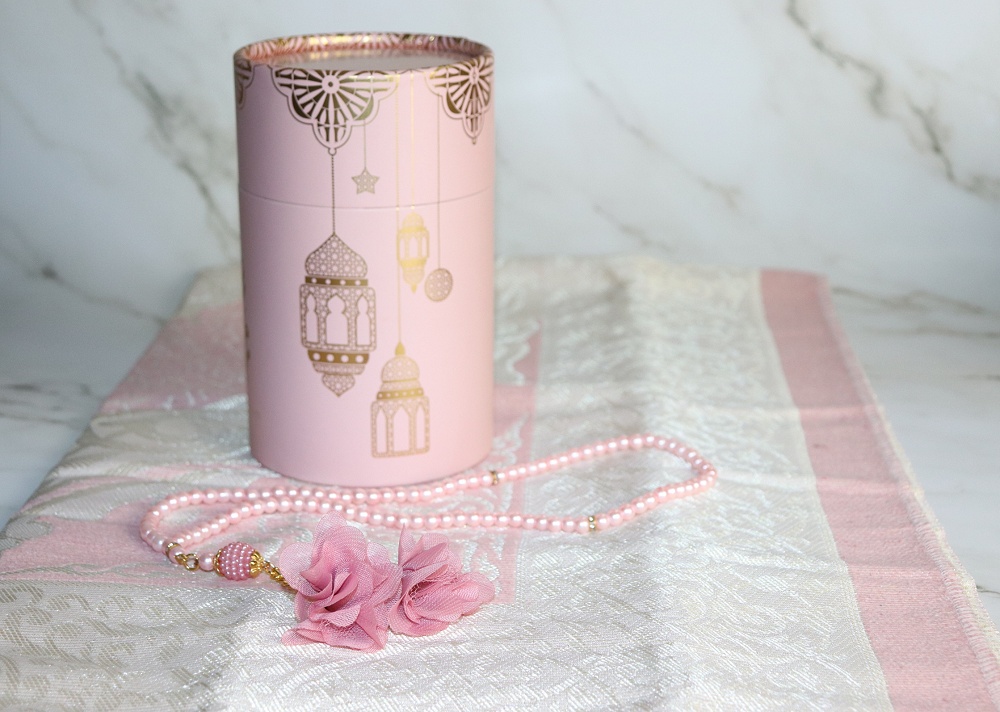 Jolie boite cadeau ronde dorée contenant un tapis brodé rose et blanc (taille adulte) et un chapelet assorti de luxe à 99 perles, avec décorations métalliques.