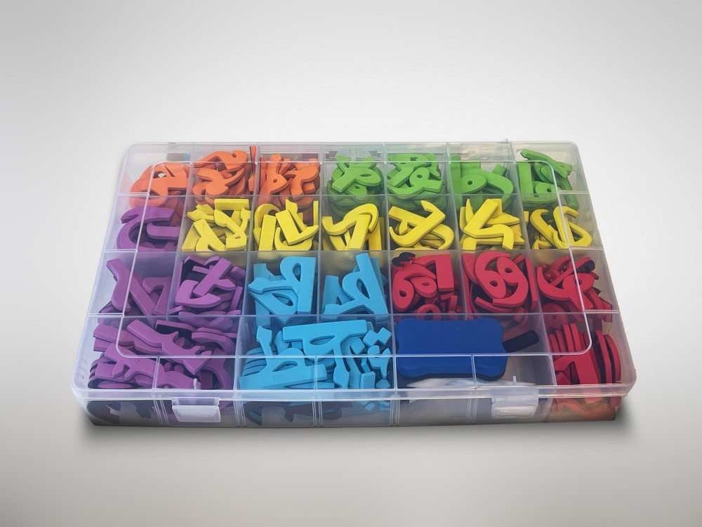 Cette mallette contient un très grand nombre de lettre et voyelles arabes magnétiques qui peuvent se fixer très facilement sur le tableau, avec toutes les combinaisons possibles afin de constituer les mots que l'on veut... Les points et les voyelles (tachkîl) sont également fournies seuls afin d'avoir encore plus de flexibilité et de possibilités d'écritures...