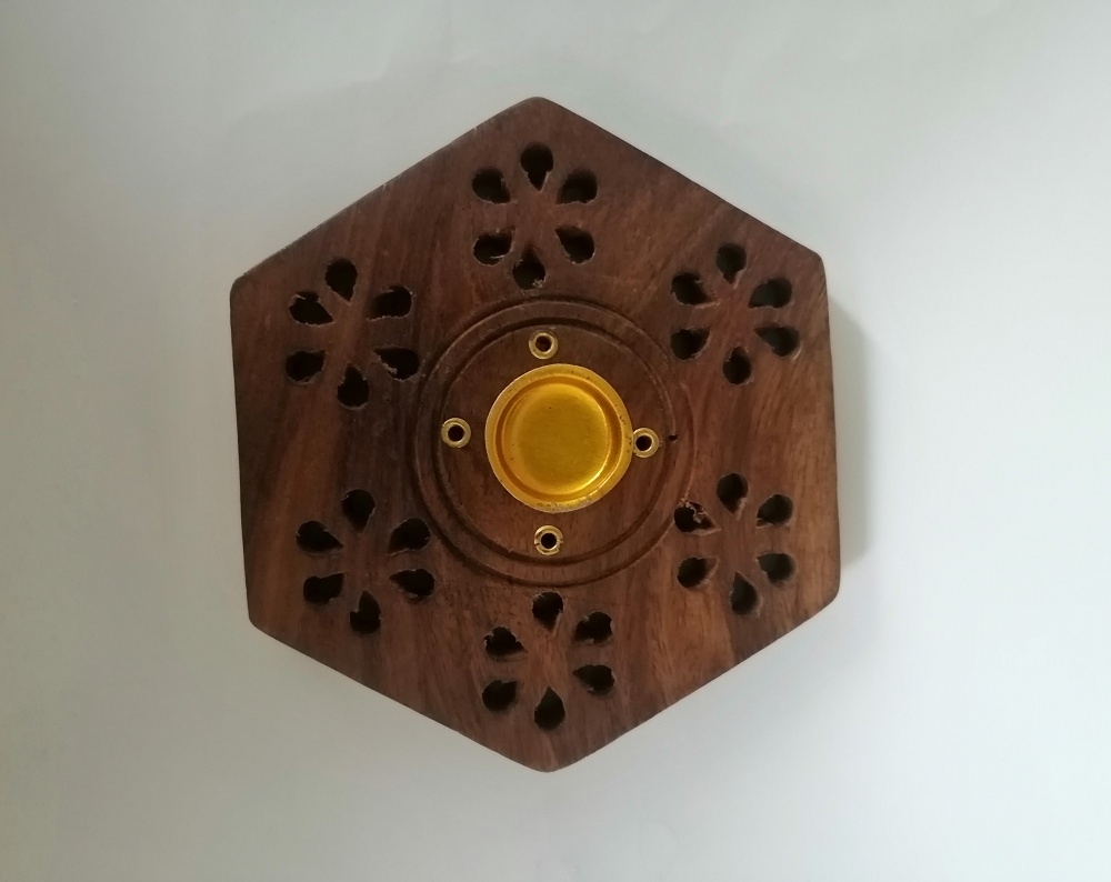 Brûleur d'encens artisanal magnifique réalisé en bois avec un ravissant motif fleur sculpté. Ce porte-encens peut supporter jusqu'à 4 bâtonnets d'encens et il est doté en plus d'un support pour encens en cône.