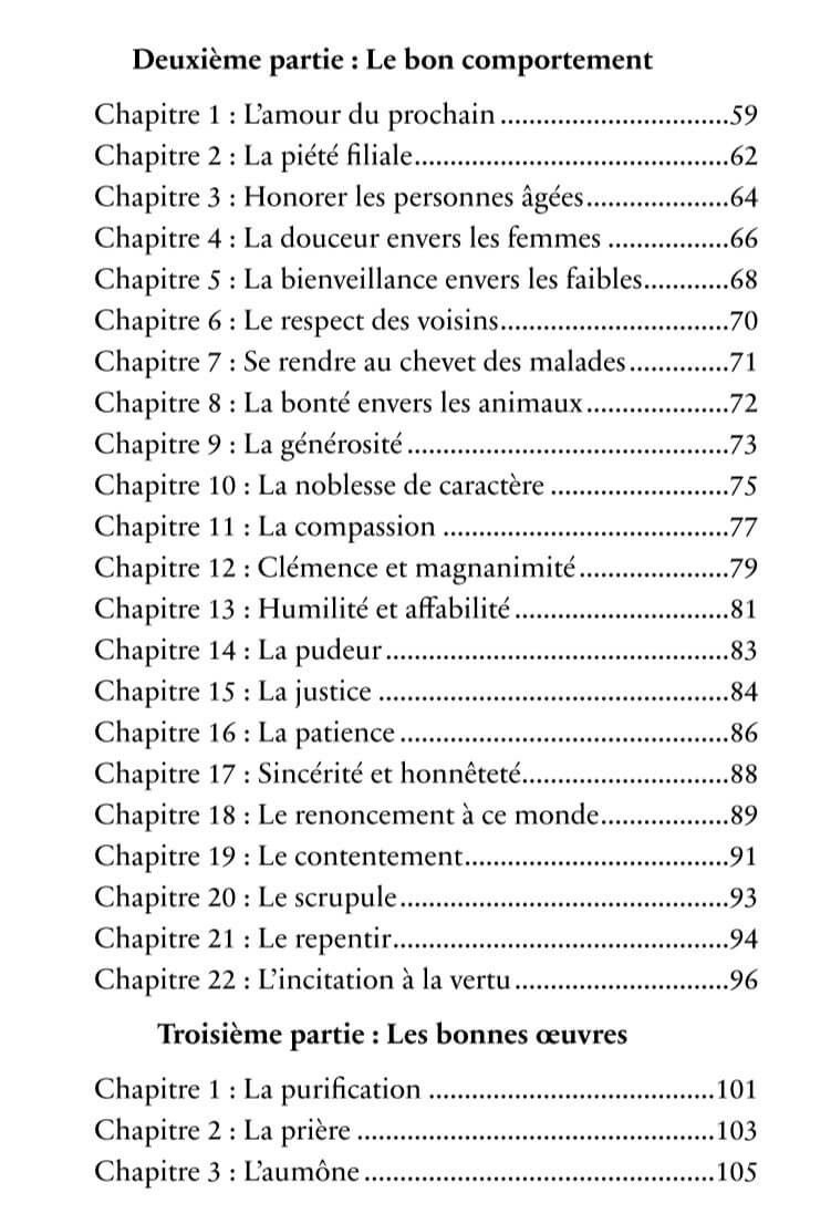 Ces hadiths ont été classés par thèmes. L'ouvrage compte cinq parties : le dogme, le bon comportement, les bonnes œuvres et les interdits. La dernière partie, quant à elle, réunit des hadiths sur différents sujets.