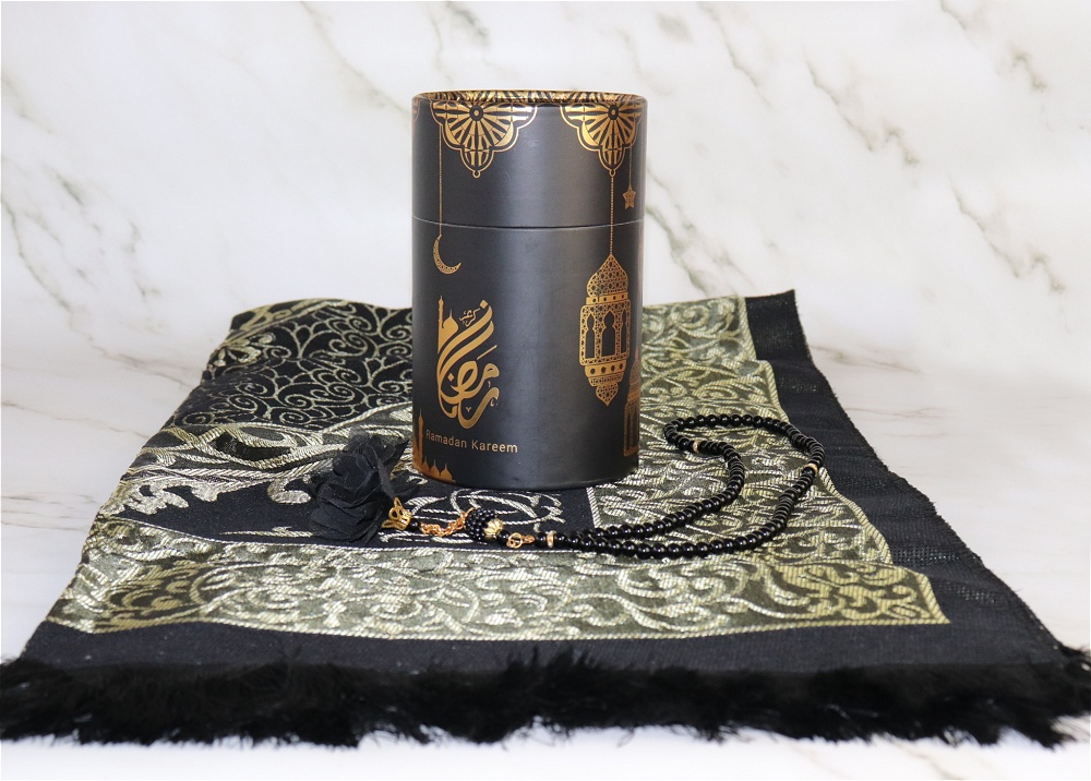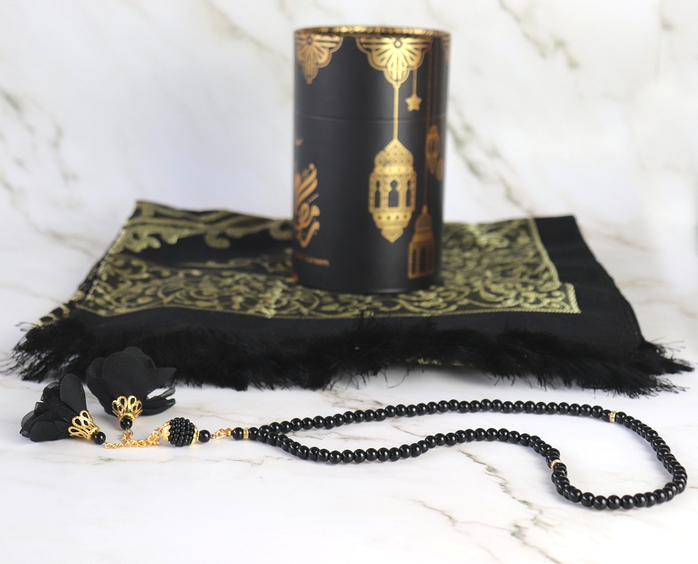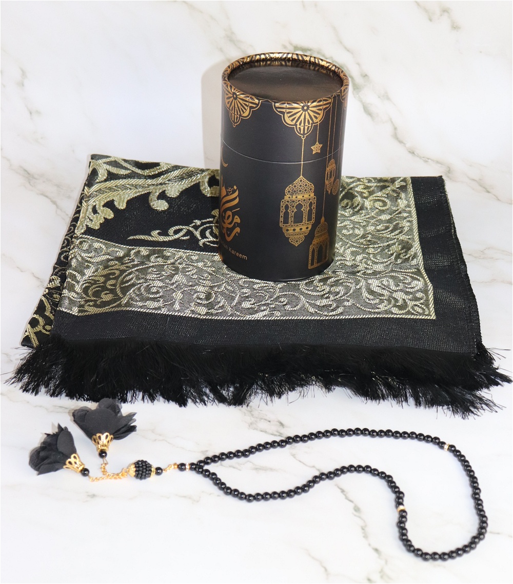 Jolie boite cadeau ronde dorée contenant un tapis brodé noir (taille adulte) et un chapelet assorti de luxe à 99 perles, avec décorations métalliques.