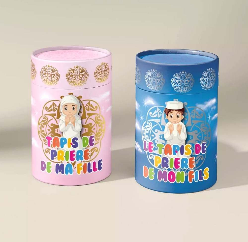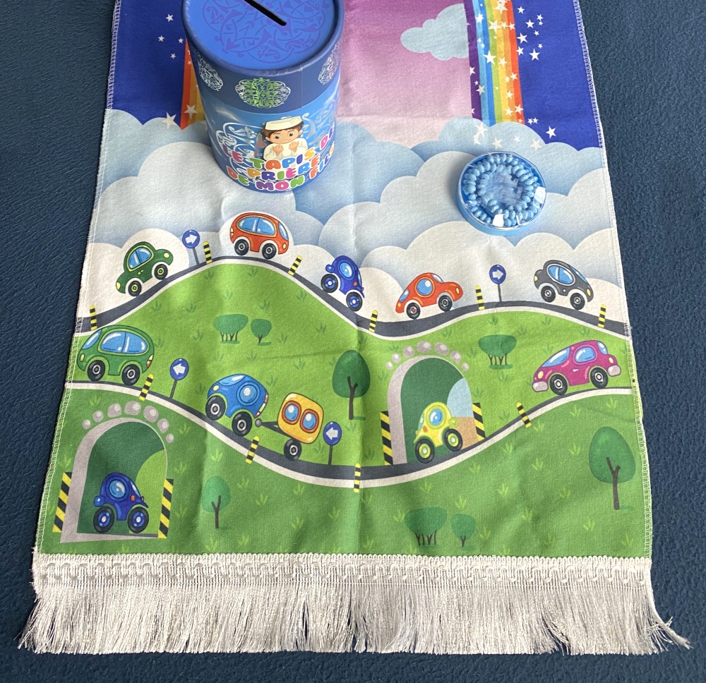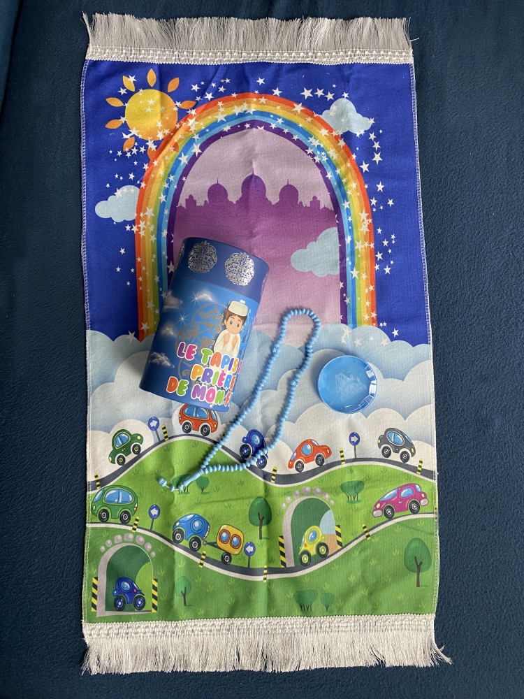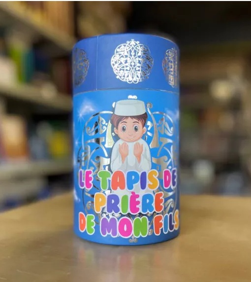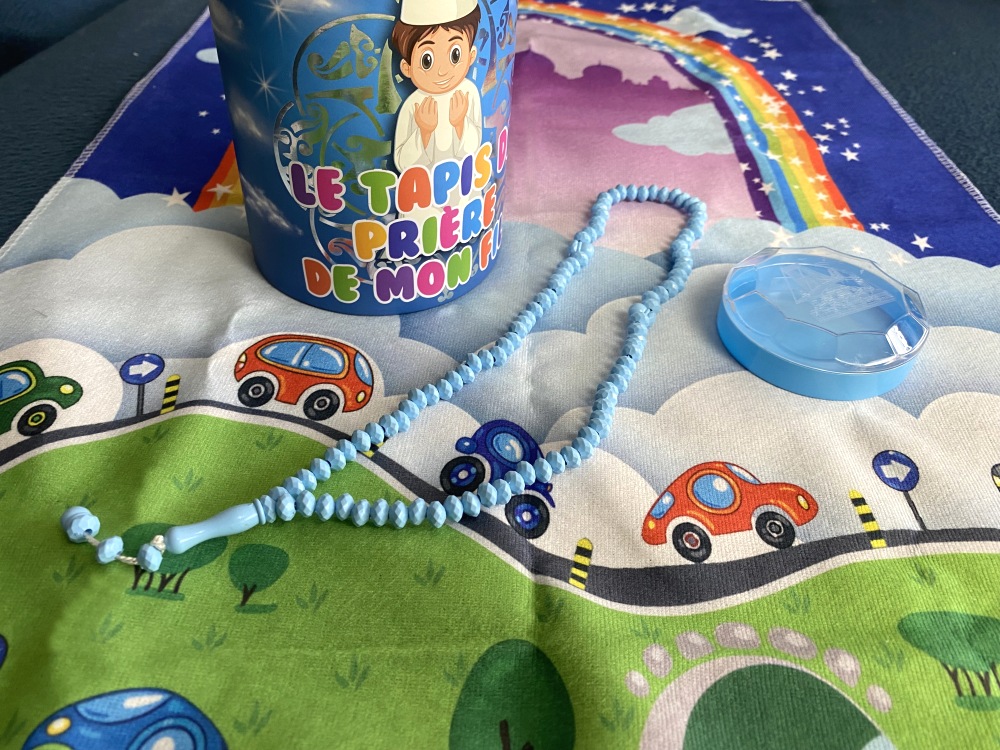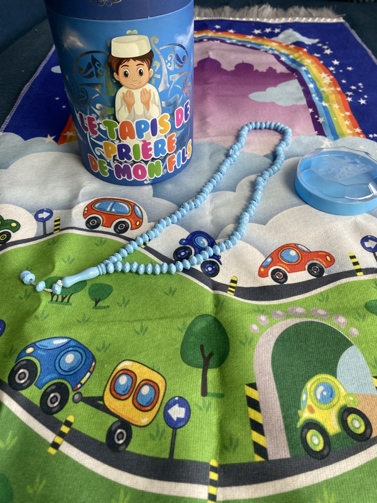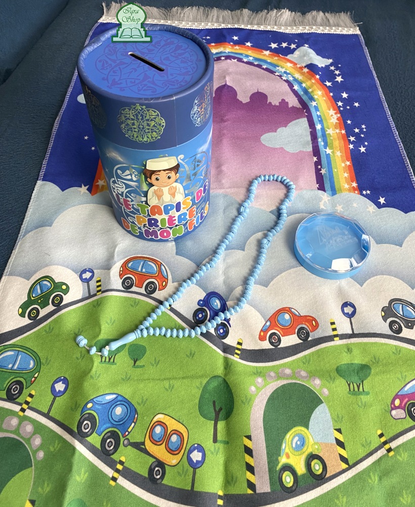 Coffret tirelire avec tapis et et chapelet parfumé (tasbih) pour enfants musulmans. Version bleue pour garçons adapté aux 3-12 ans. Existe également en version fille.