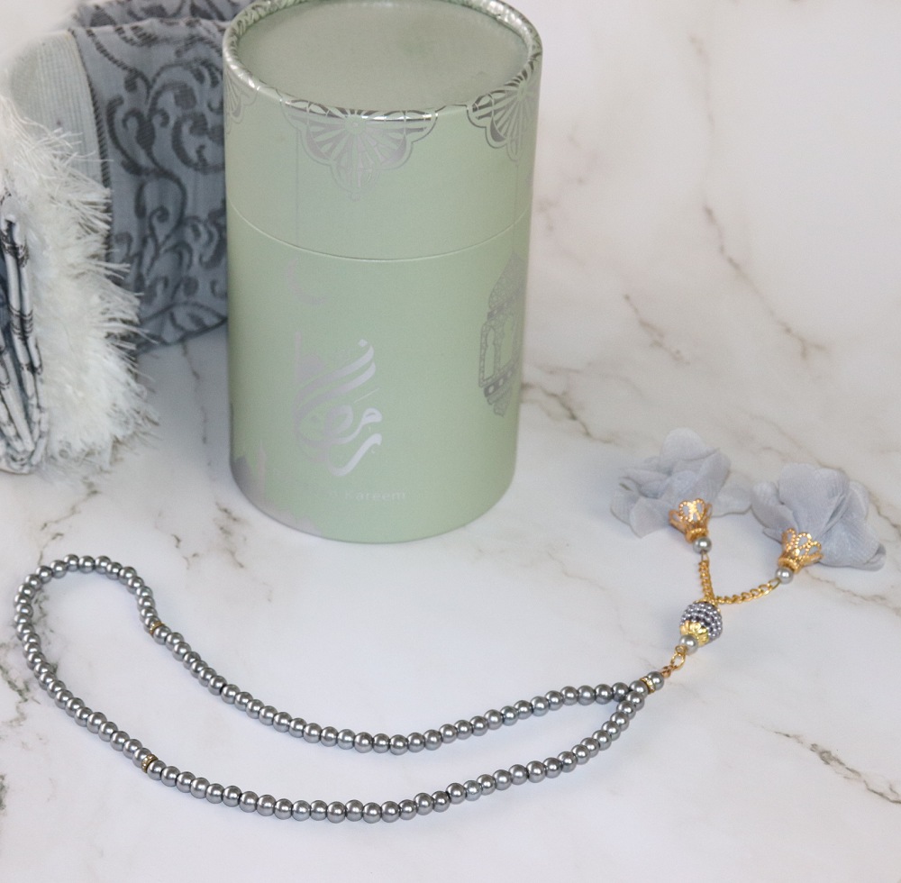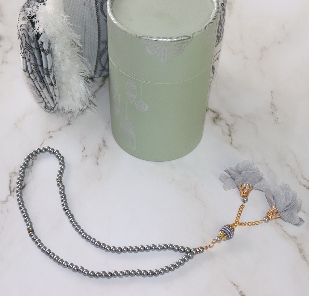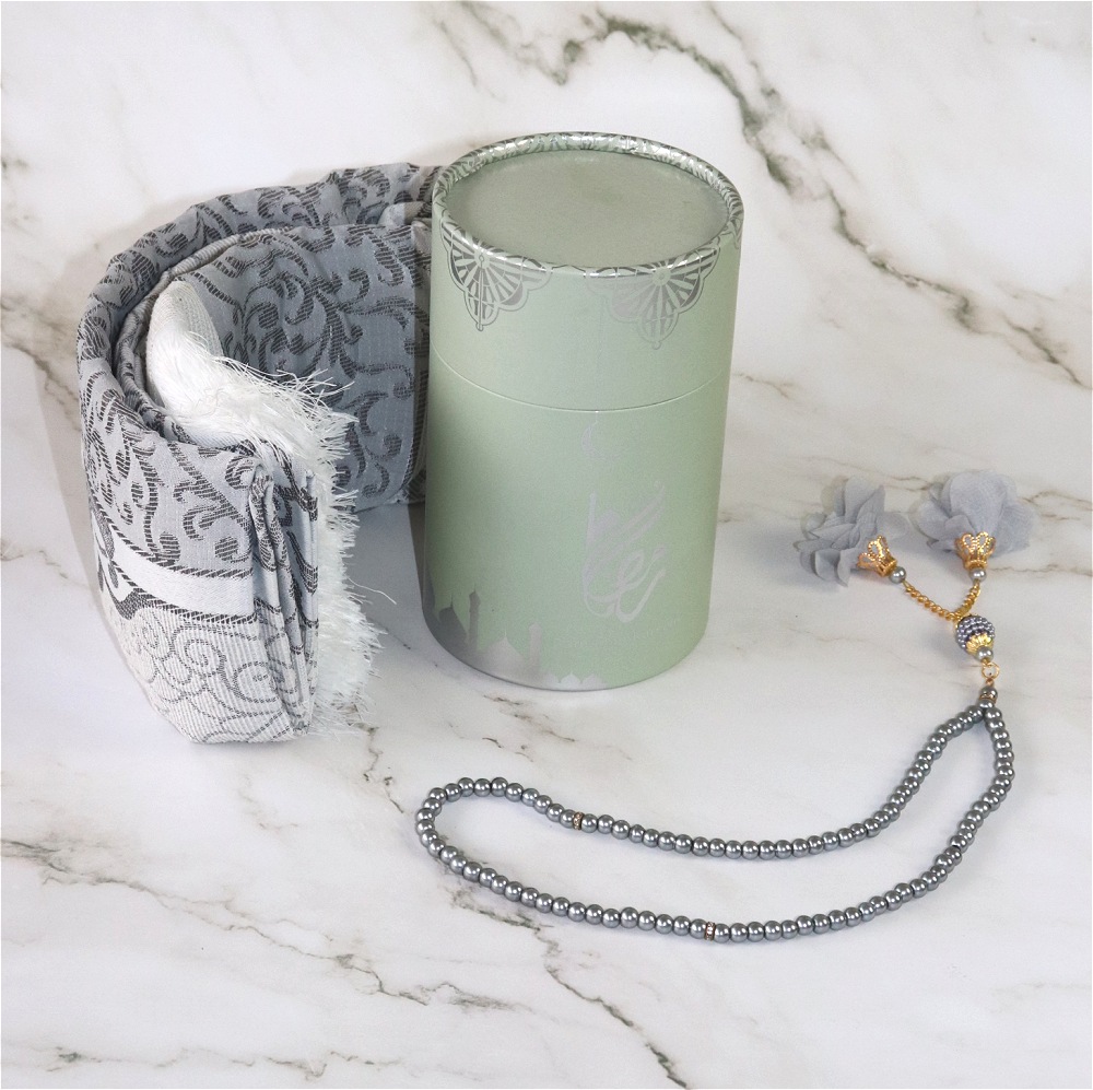 Coffret Cadeau "Ramadan Kareem" : Boite cadeau avec Tapis et Chapelet deluxe assorti - Couleur Gris argenté Deco & Cadeau
