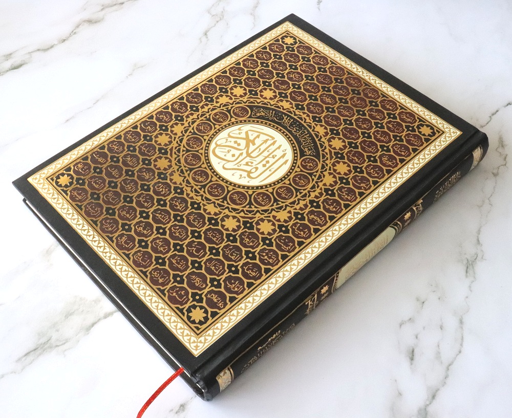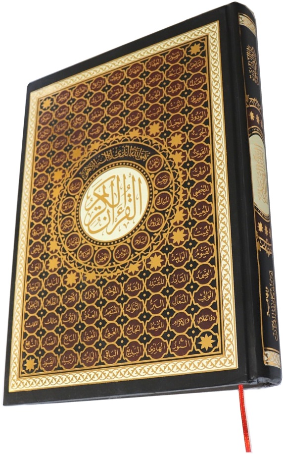 Très Grand Coran (26 x 35 cm) en langue arabe (Lecture Hafs) avec couverture décorée en rouge et dorures contenant l'inscription des 99 Beaux Noms d'Allah (Asmâ'-Allah al-housnâ).