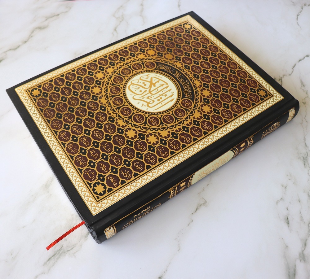 Impression en deux couleurs sur du papier de qualité couleur crème. Marque page intégré. Très grande écriture du texte arabe.