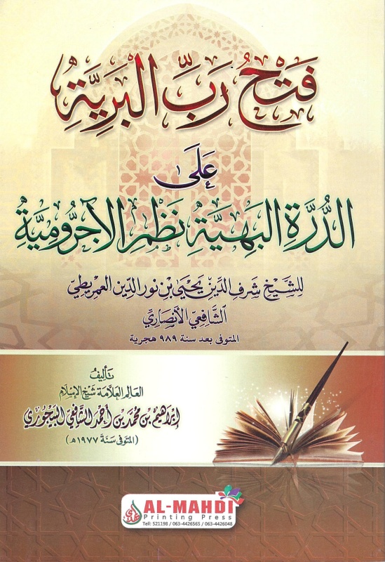 يقولُ إبراهيمُ البَيْجُورِيُّ ذُو التقصيرِ غَفَرَ لهُ مَوْلَاهُ الخبيرُ البصيرُ: قد الْتَمَسَ مِنِّي بعضُ الإخوانِ - أَصْلَحَ اللهُ لي ولَهُ الحالَ والشانَ - شَرْحًا لَطِيفًا على نظمِ الآجُرُّومِيَّةِ في علمِ العربيَّةِ لشرفِ الدينِ يَحْيَى العِمْرِيطيِّ رَحِمَهُ اللهُ تعالى فَأَجَبْتُهُ إلى ذلكَ وإنْ لمْ أَكُنْ أهلًا لِمَا هنالكَ فجاءَ بِحَمْدِ اللهِ شَرْحًا يَحِلُّ ألفاظَهُ ويُبَيِّنُ مرادَهُ ويُتَمِّمُ مَفَادَهُ ويُذَلِّلُ صِعَابَهُ ويَكْشِفُ نِقَابَهُ. *سَمَّيْتُهُ (فَتْحُ رَبِّ البَرِيَّةِ على الدُّرَّةِ البَهِيَّةِ نَظْمَ الآجْرُومِيَّةِ) واللهَ أسألُ أنْ ينفعَ بهِ النفعَ العميمَ، إنَّهُ جَوَادٌ كريمٌ.