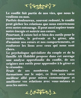 Le psychologue spécialiste du couple et de la famille Ali Habibbi propose dans cet ouvrage une analyse approfondie du conflit, de ses origines aux outils pour apprendre à le gérer et le résoudre. Fruit de ses nombreux séminaires et formations sur le sujet, ce livre sera votre meilleur allié pour mieux communiquer et améliorer vos relations avec vous-mêmes et avec les autres.