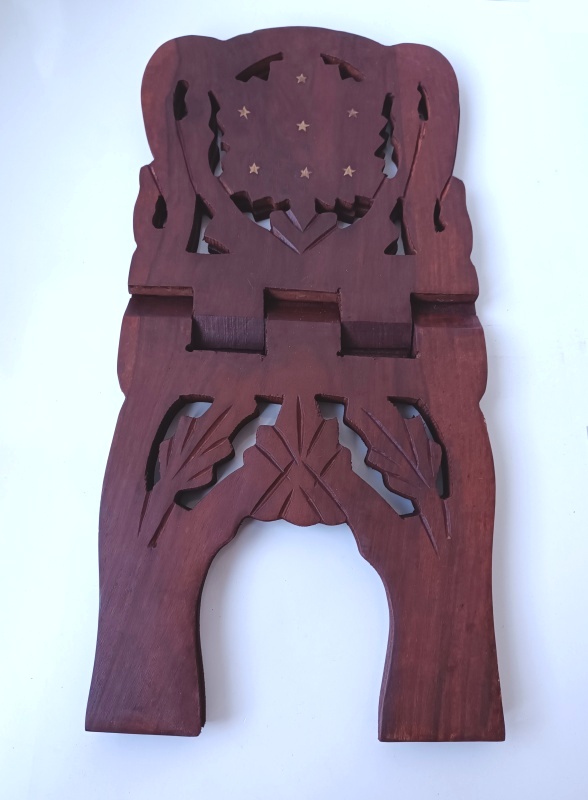 Grand porte Coran artisanal en bois joliment sculpté et décoré (32 cm) - REF. 26757 (8.75 €)