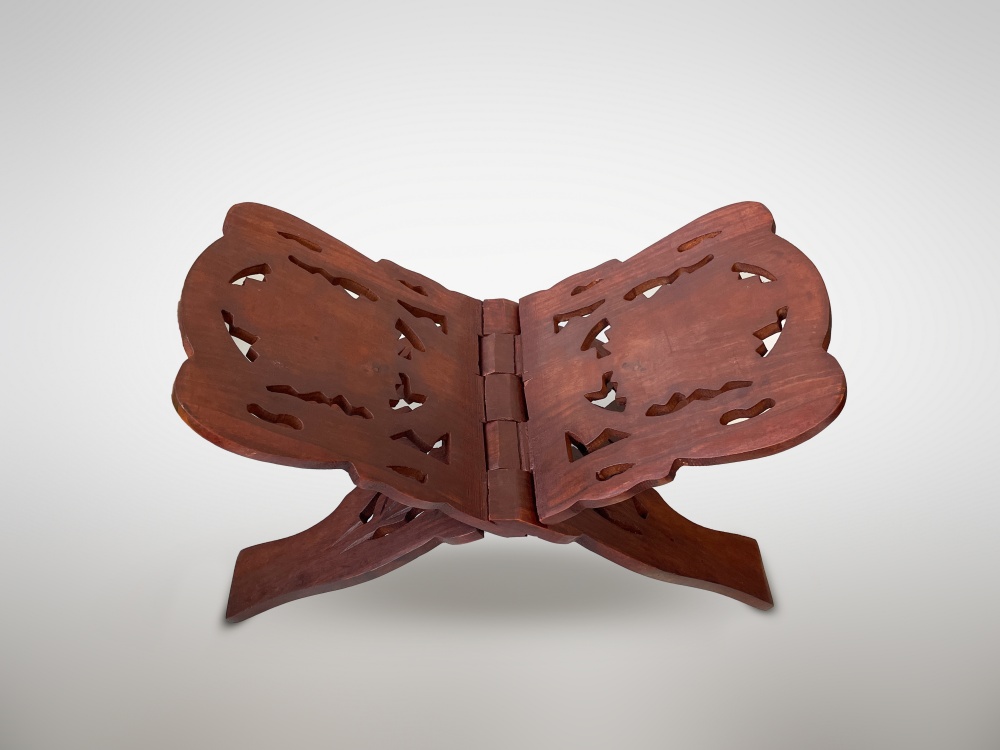 Joli porte Coran, de grande taille, fabriqué artisanalement en bois, teinté en marron clair, et magnifiquement sculpté de motifs en feuilles d'arbre.