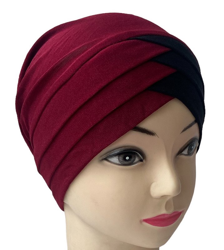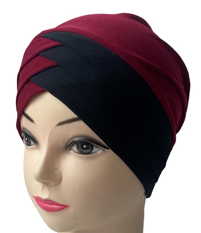 Turban bonnet croisé bicolore femme moderne - Couleur Noir et Rouge bordeaux - REF. 39994 (3.90 €)