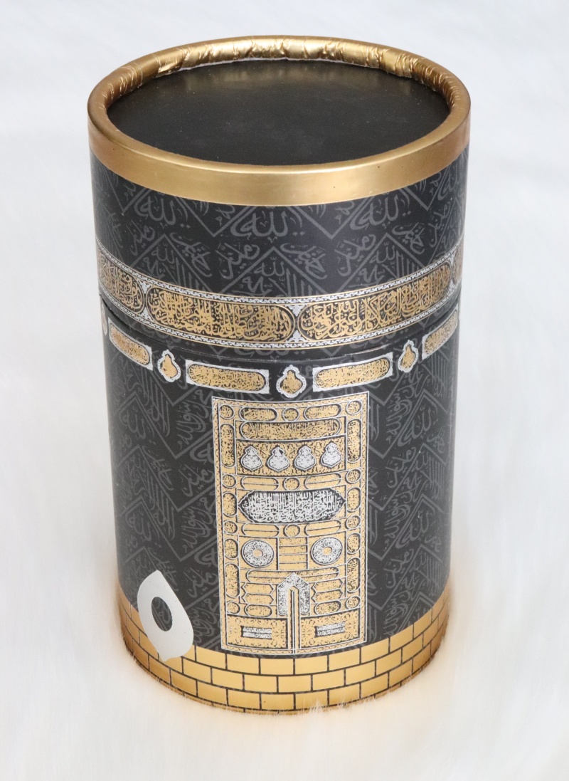 Coffret Cadeau Muslim boite ronde Kaaba (Couleur noire doré assorti) avec tapis de prière et chapelet de luxe + Parfum Musc Al-Kaaba - REF. 36005 (14.90 €)