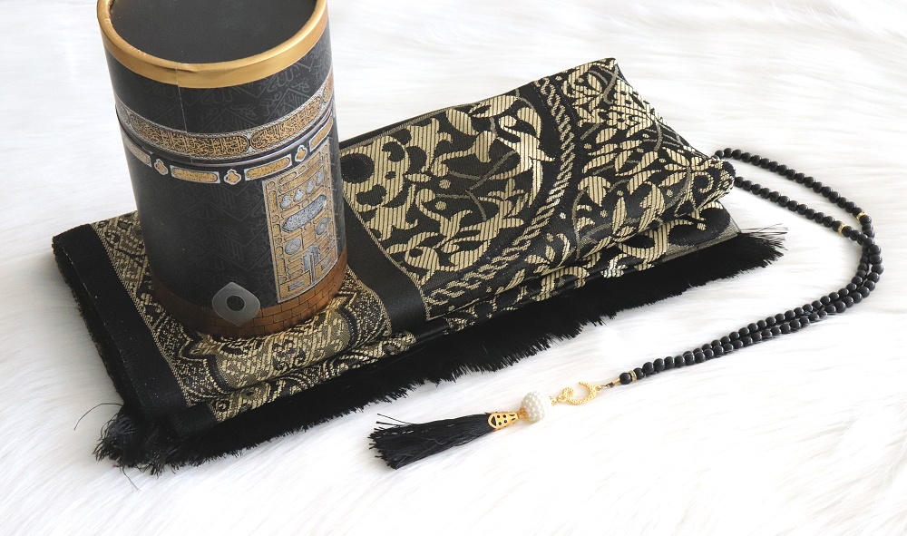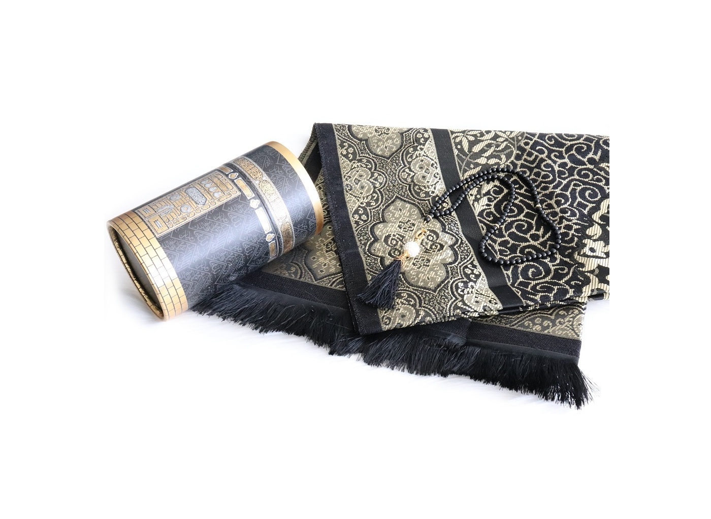 Coffret Cadeau Priere Tapis et chapelet de luxe (boite ronde doree) - Couleur noir avec motif de la Kaaba