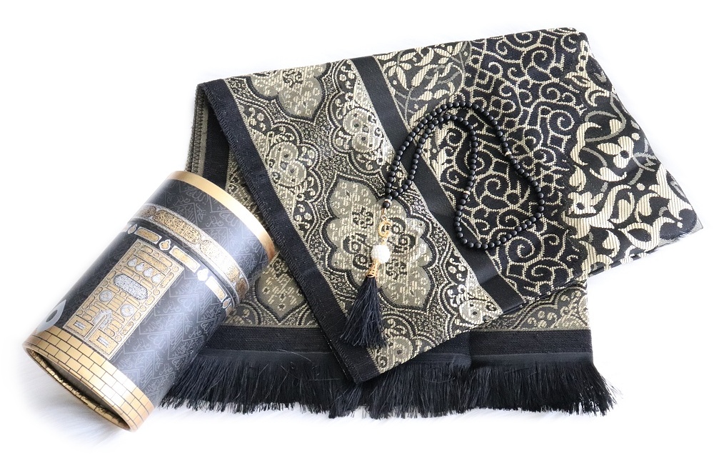 Coffret Cadeau Prière Tapis et chapelet de luxe (boite ronde dorée) - Couleur noir avec motif de la Kaaba - REF. 40032 (14.90 €)