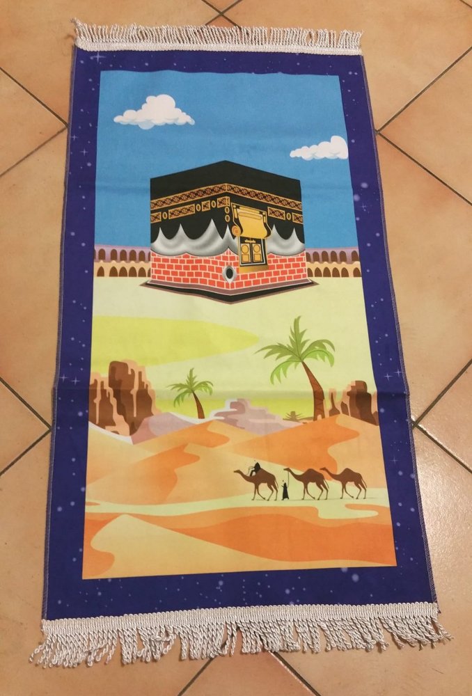 Tapis de prière (Sajjadat-Salat) pour enfants et ados musulmans avec dessin Kaaba (Plusieurs couleurs disponibles) - Illustration Kaba, désert, chameaux - REF. 35865 (7.50 €)