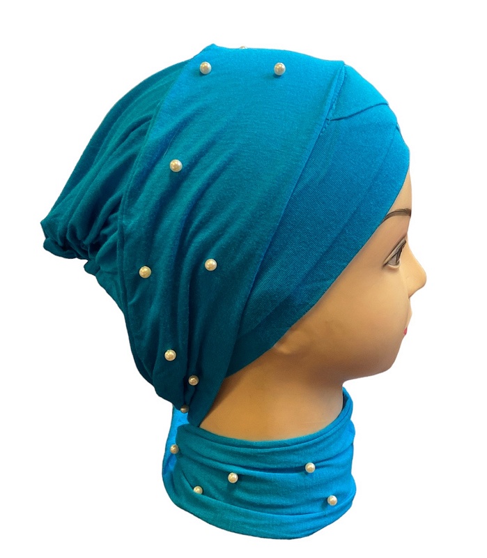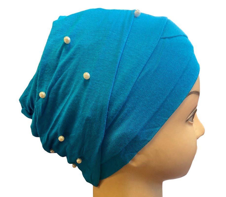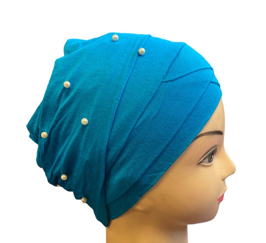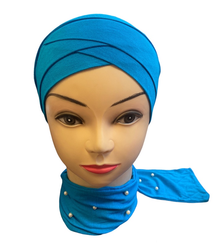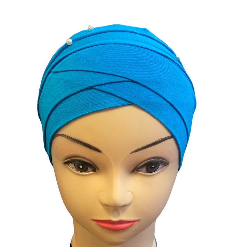Bonnet turban croisé devant avec bandelette perlé à enrouler, très facile à mettre.