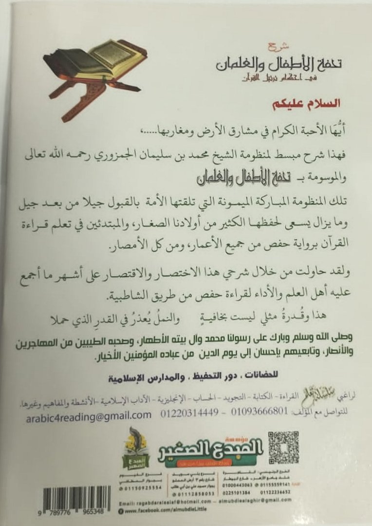 هذا تعليق على منظومة الشيخ محمد بن سليمان المزوري رحمه الله تعالى والمسومة بـ تحفة الاطفال والغلمان. تلك المنظومة المباركة الميمونة التي تلقتها الامة بالقبول جيلا بعد جيل وما زال يسعى لحفظها الكثير من اولادنا الصغار والمبتدئين في تعلم قراءة القران برواية حفص من جميع الاعمار والامصار. ولقد كان التعليق مختصرا واقتصر على اشهر ما اجمع عليه اهل العلم والاداء لقراءة حفص من طريق الشاطبية