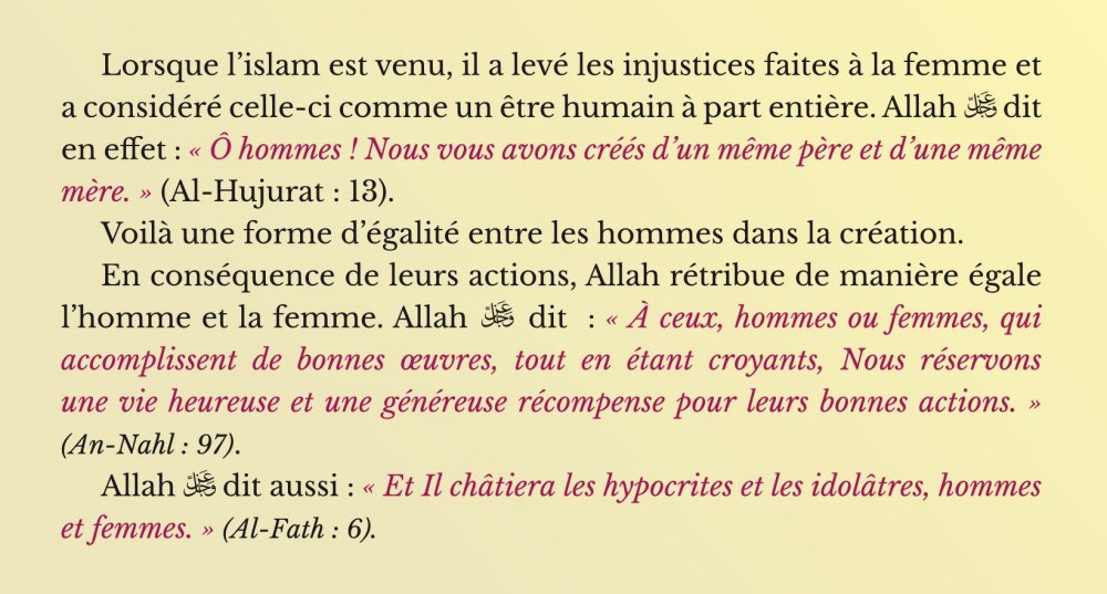 L’islam honore la femme, n’en déplaise à toutes celles et ceux qui prennent un malin plaisir à dénigrer notre merveilleuse religion. Dans le Coran, Allah fait notamment mention des droits et des devoirs des femmes tout comme les hommes. Quant au messager d’Allah, que la paix et la bénédiction soient sur lui, il nous a enseigné l’importance d’être bienveillant à l’égard de nos mères, de nos sœurs et de nos épouses.