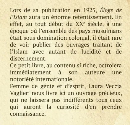 Lors de sa publication en 1925, Éloge de l’Islam aura un énorme retentissement. En effet, au tout début du XXe siècle, à une époque où l’ensemble des pays musulmans était sous domination colonial, il était rare de voir publier des ouvrages traitant de l’Islam avec autant de lucidité et de discernement. Ce petit livre, au contenu si riche, octroiera immédiatement à son auteure une notoriété internationale. Femme de génie et d’esprit, Laura Veccia Vaglieri nous livre ici un ouvrage précieux, qui ne laissera pas indifférents tous ceux qui auront la curiosité d’en prendre connaissance.