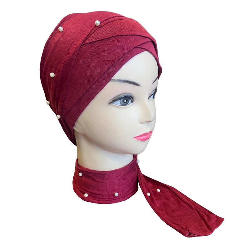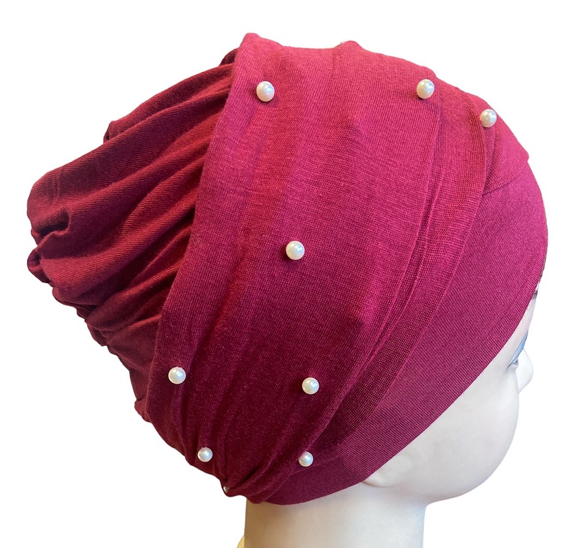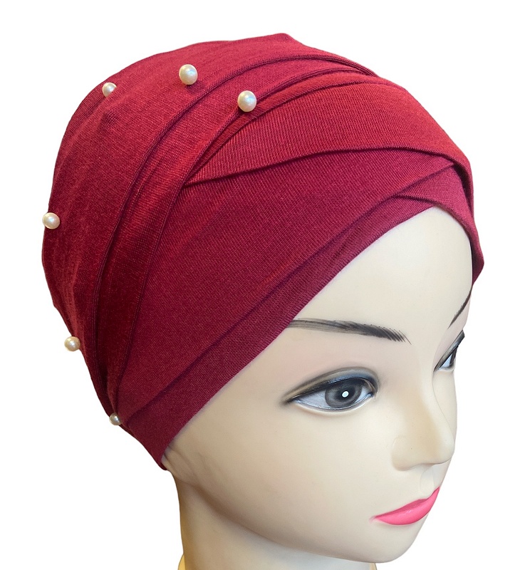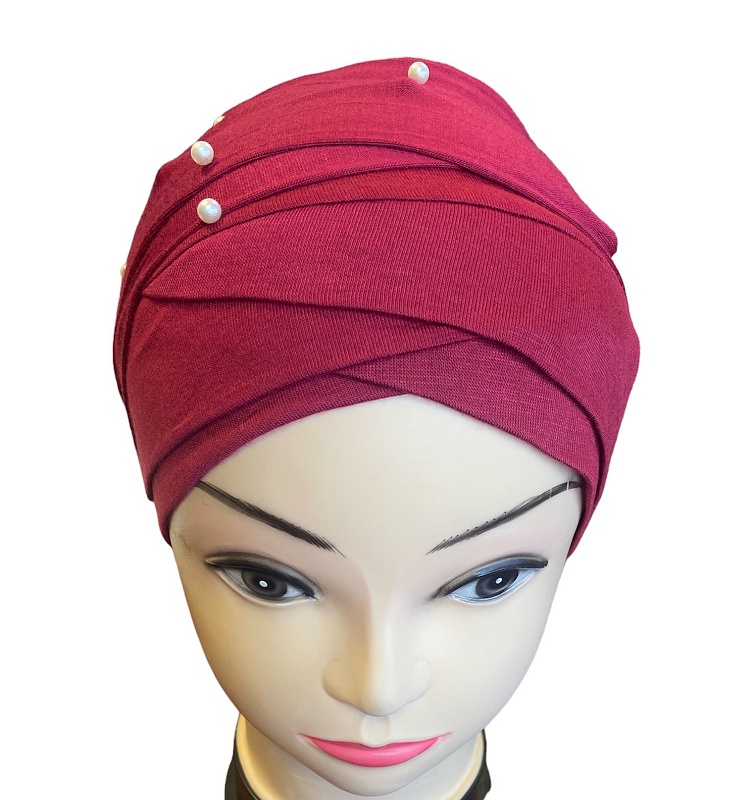 Bonnet turban croisé devant avec bandelette perlé à enrouler, très facile à mettre.