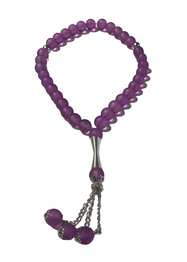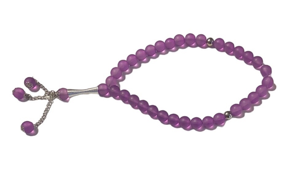 Chapelet (Subha) de luxe à 33 grosses perles de couleur Mauve avec parties argentées.