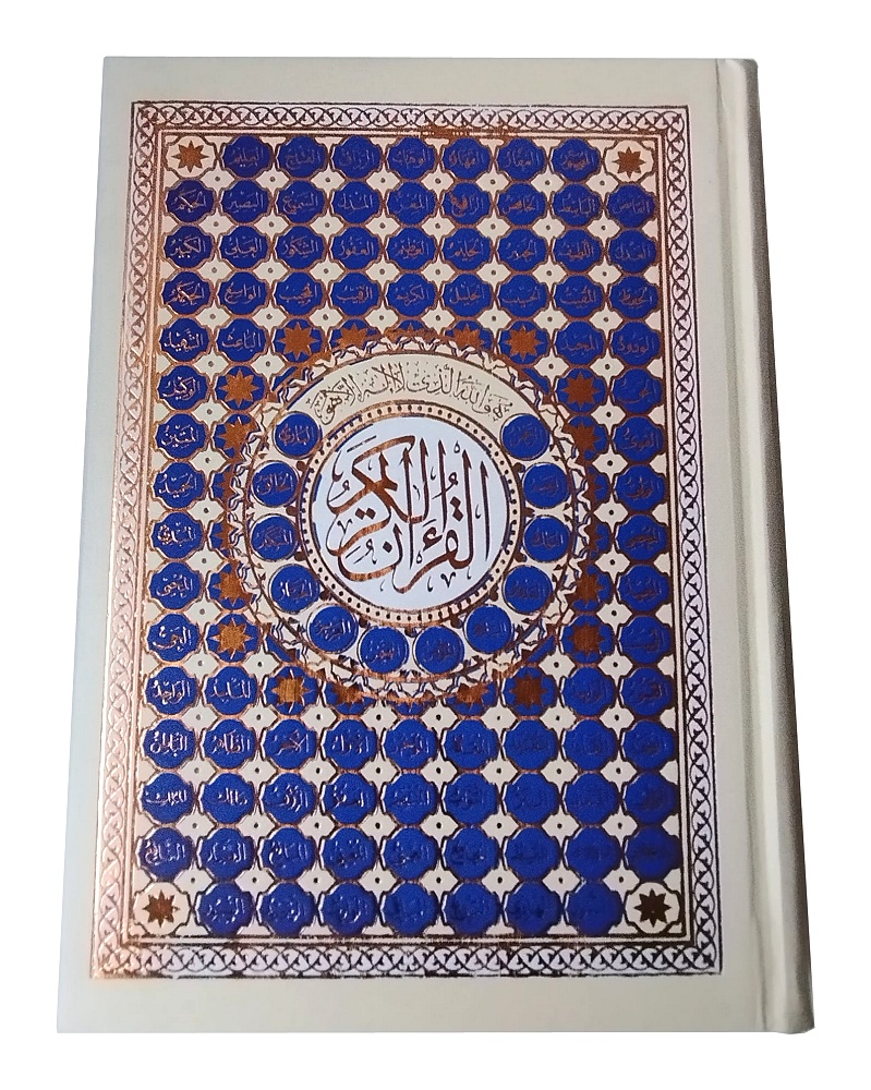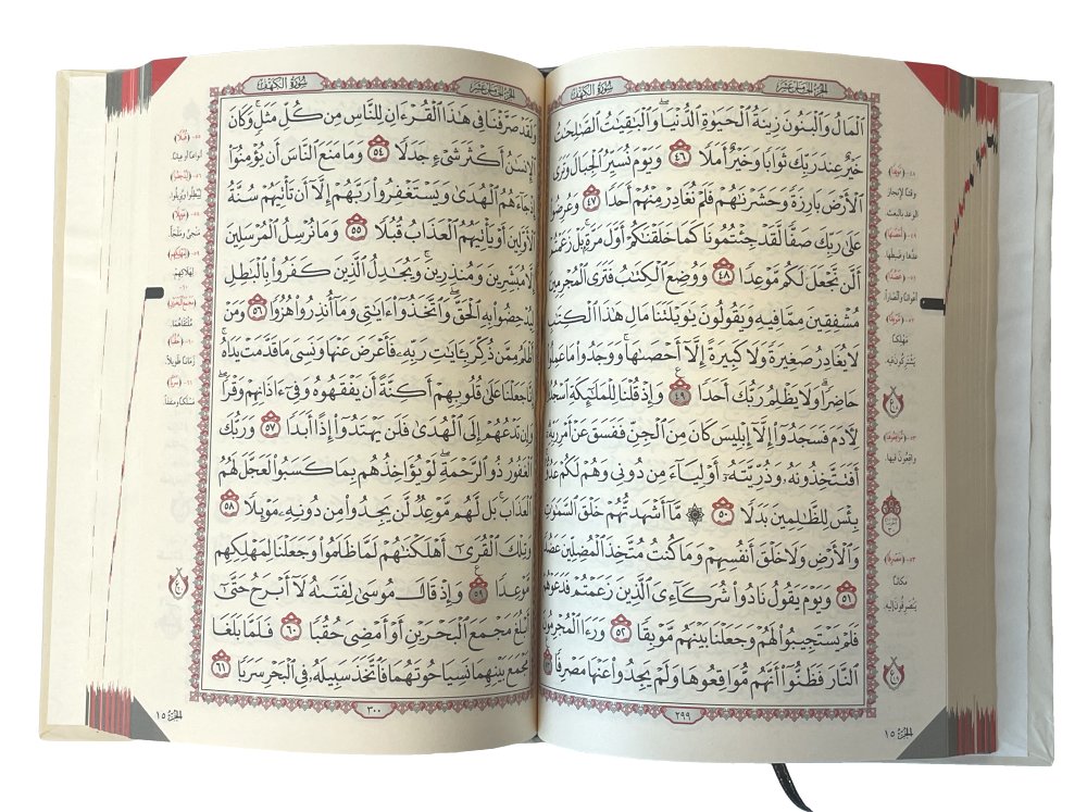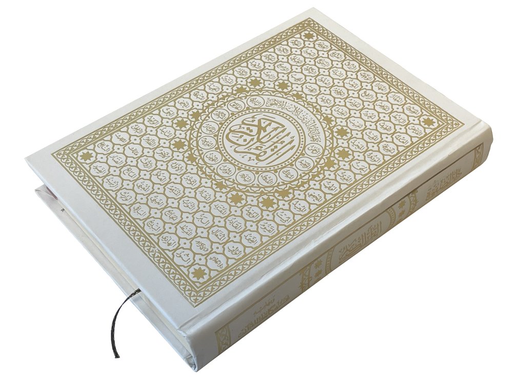 Grand Coran (17 x 24 cm) en langue arabe (Lecture Hafs) avec couverture décorée en rouge et dorures.