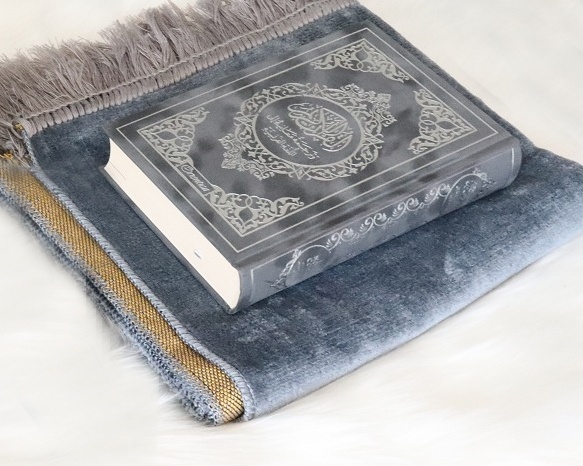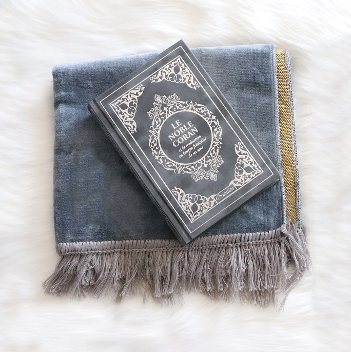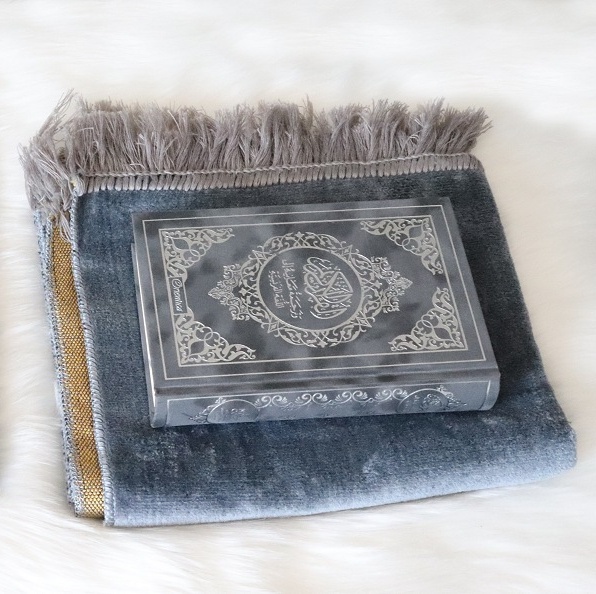 Pack cadeau Gris : Le Noble Coran bilingue francais/arabe (edition de luxe en daim argente) + Tapis en velours couleur unie assortie (Coffret Muslim pour homme)