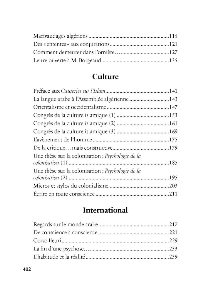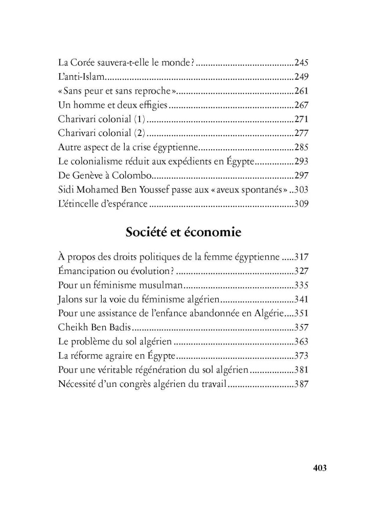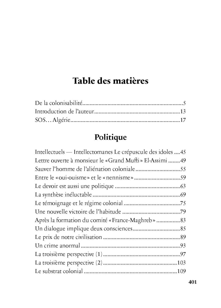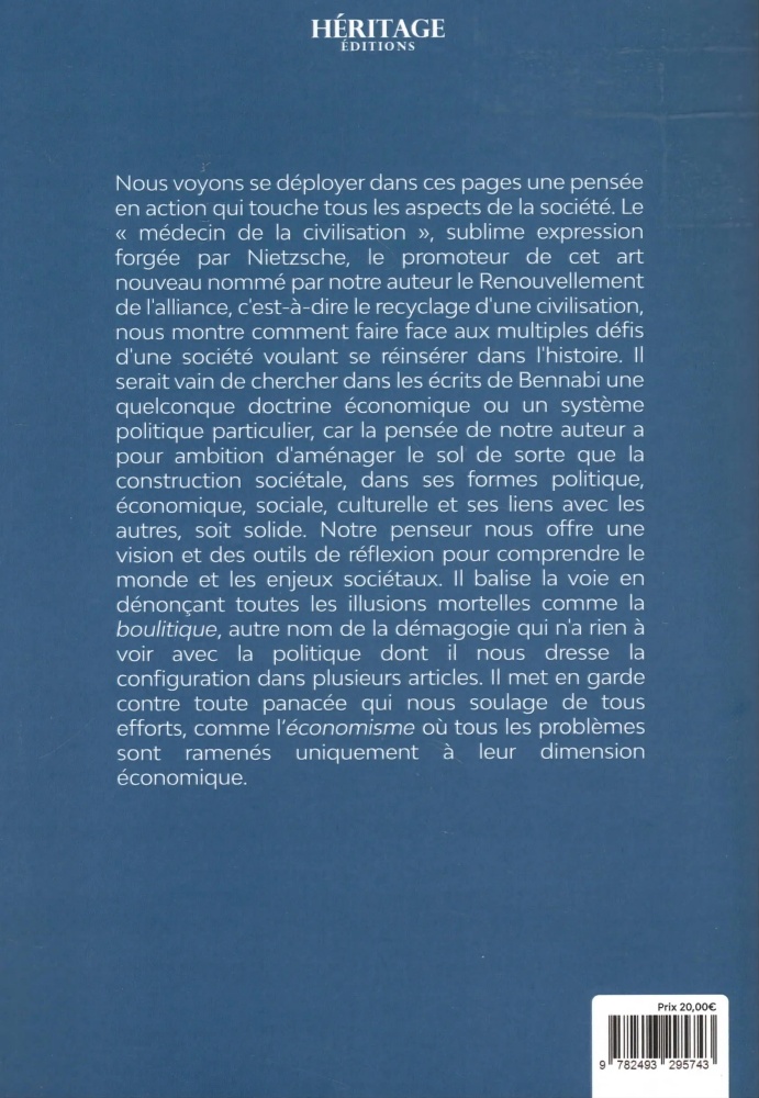 Nous voyons se déployer dans ces pages une pensée en action qui touche tous les aspects de la société. Le « médecin de la civilisation », sublime expression forgée par Nietzsche, le promoteur de cet art nouveau nommé par notre auteur le Renouvellement de l'alliance, c'est-à-dire le recyclage d'une civilisation, nous montre comment faire face aux multiples défis d'une société voulant se réinsérer dans l'histoire. Il serait vain de chercher dans les écrits de Bennabi une quelconque doctrine économique ou un système politique particulier, car la pensée de notre auteur a pour ambition d'aménager le sol de sorte que la construction sociétale, dans ses formes politique, économique, sociale, culturelle et ses liens avec les autres, soit solide.