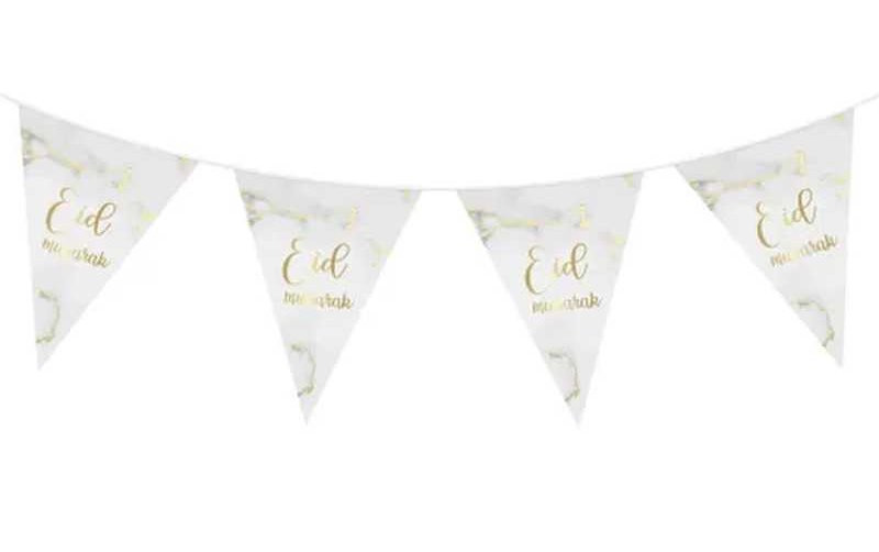 Ligne de drapeaux (fanions) en plastique avec décoration marbre et impression dorée "Eid Mubarak" pour la fête de l'Aïd.