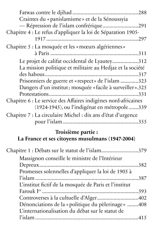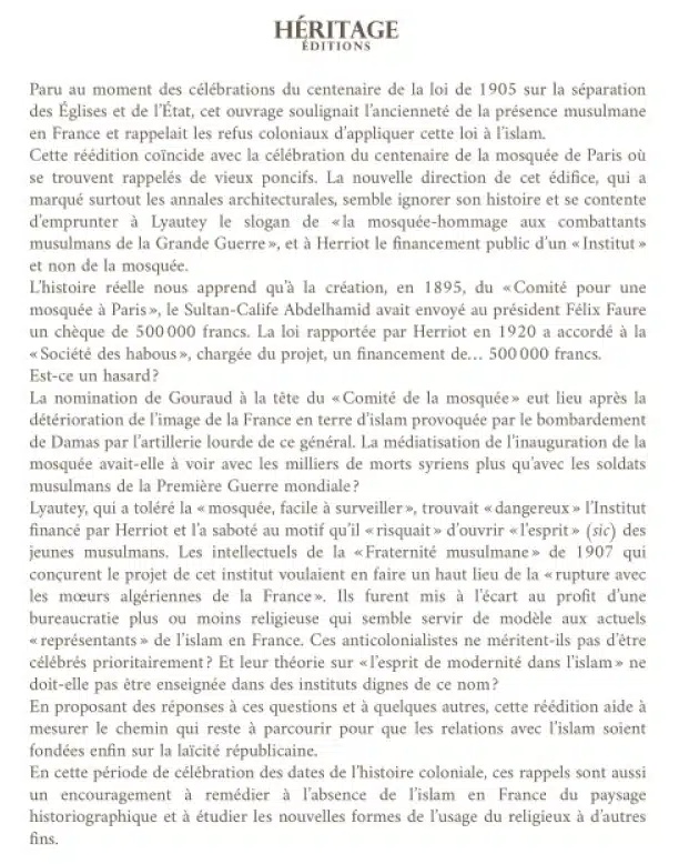 Paru au moment des célébrations du centenaire de la loi de 1905 sur la séparation des Églises et de l’État, cet ouvrage soulignait l’ancienneté de la présence musulmane en France et rappelait les refus coloniaux d’appliquer cette loi à l’islam. Cette réédition coïncide avec la célébration du centenaire de la mosquée de Paris où se trouvent rappelés de vieux poncifs.