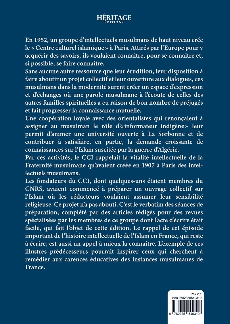Les fondateurs du CCI, dont quelques-uns étaient membres du CNRS, avaient commencé à préparer un ouvrage collectif sur l’Islam où les rédacteurs voulaient assumer leur sensibilité religieuse. Ce projet n’a pas abouti. C’est le verbatim des séances de préparation, complété par des articles rédigés pour des revues spécialisées par les membres de ce groupe dont l’acte d’écrire était facile, qui fait l’objet de cette édition. Le rappel de cet épisode important de l’histoire intellectuelle de l’Islam en France, qui reste à écrire, est aussi un appel à mieux la connaître. L’exemple de ces illustres prédécesseurs pourrait inspirer ceux qui cherchent à remédier aux carences éducatives des instances musulmanes de France.