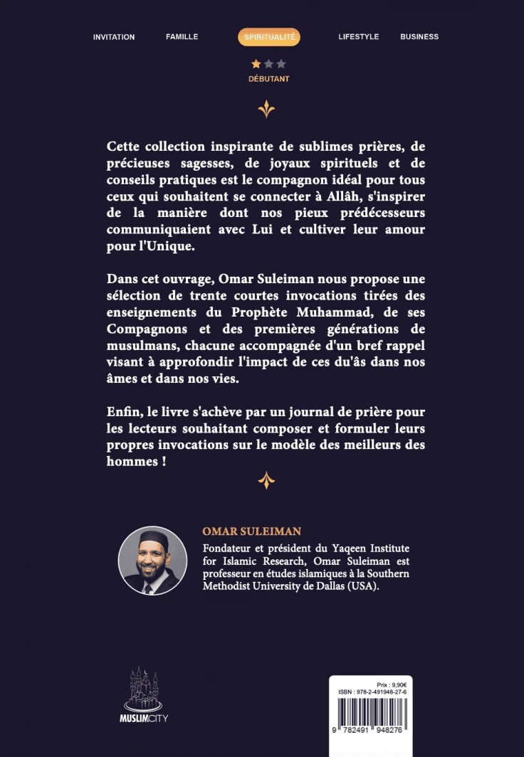 Dans cet ouvrage, Omar Suleiman nous propose une sélection de trente courtes invocations tirées des enseignements du Prophète Muhammad, de ses Compagnons et des premières générations de musulmans, chacune accompagnée d’un bref rappel visant à approfondir l’impact de ces du’âs dans nos âmes et dans nos vies.
