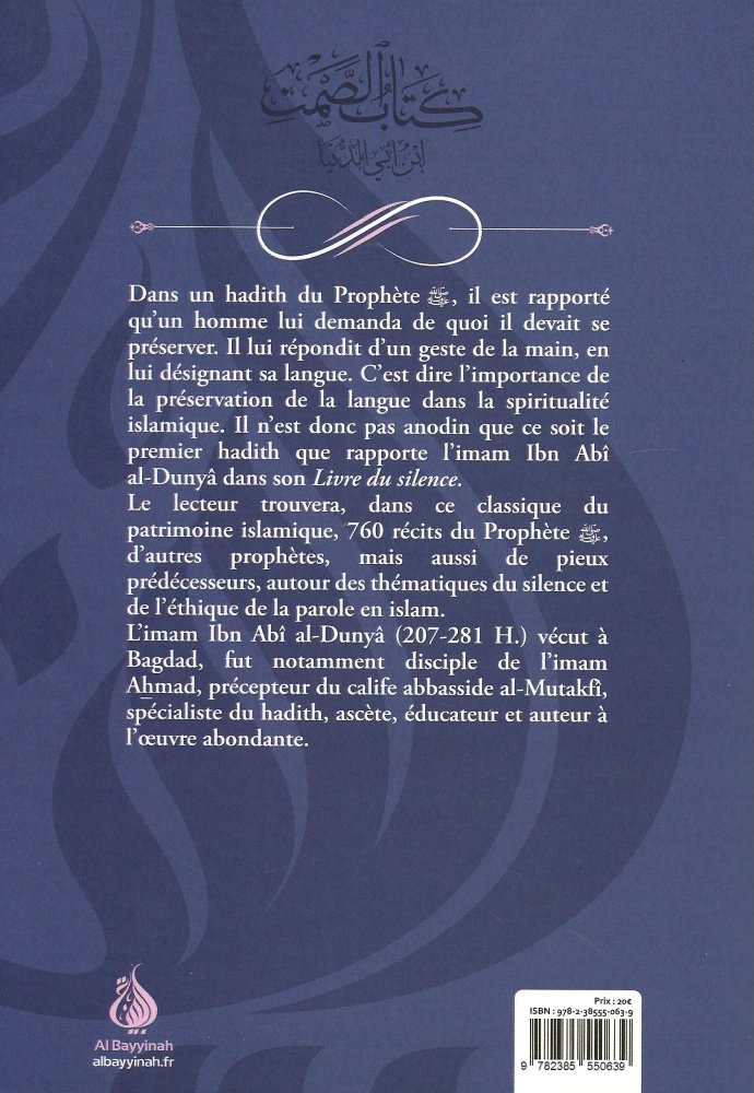 Il n'est donc pas anodin que ce soit le premier hadith que rapporte l'imam Ibn Abî al-Dunyâ dans son Livre du silence. Le lecteur trouvera, dans ce classique du patrimoine islamique, 760 récits du Prophète (paix et salut sur lui), d'autres prophètes, mais aussi de pieux prédécesseurs, autour des thématiques du silence et de l'éthique de la parole en islam.