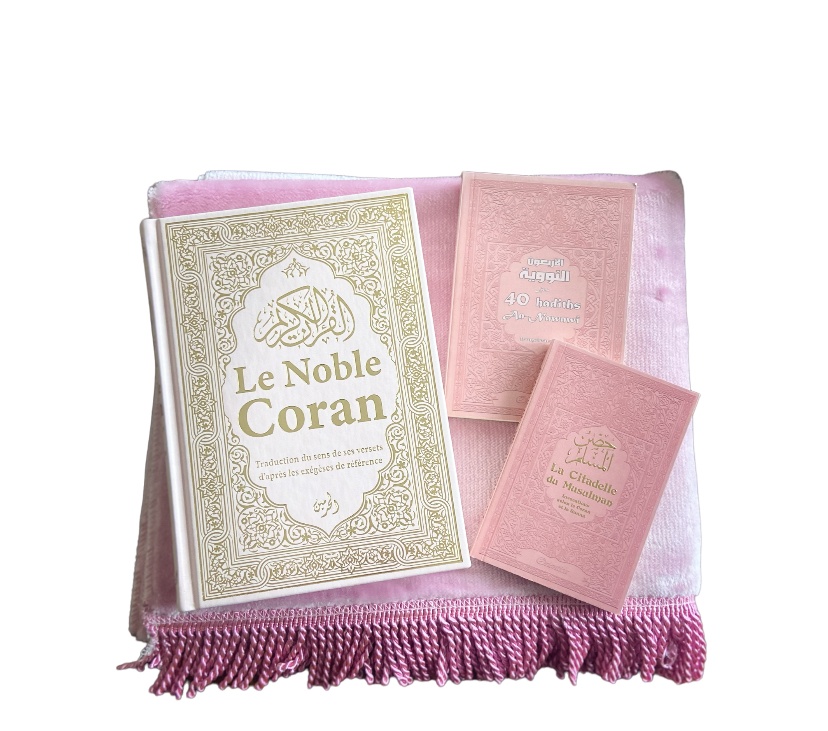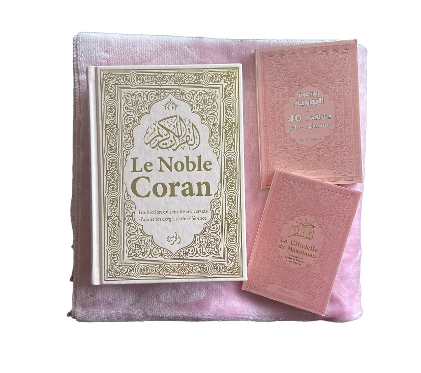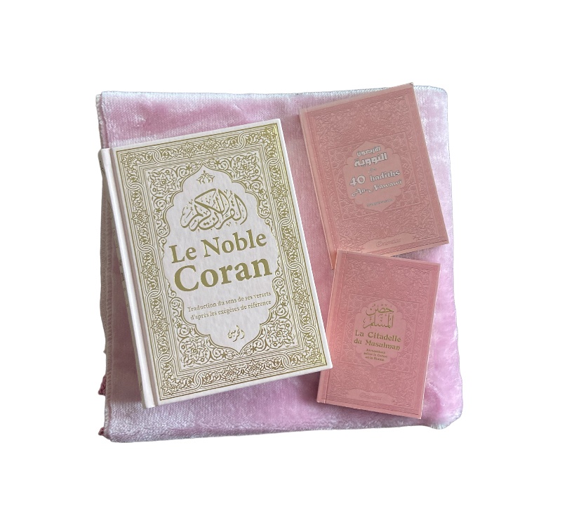 Pack cadeau de luxe rose clair pour femmes : Le Saint Coran, La Citadelle (français/arabe/phonétique) + Porte Coran + Tapis + Chapelet + Parfum Musc pour femme - REF. 24004 (55.00 €)